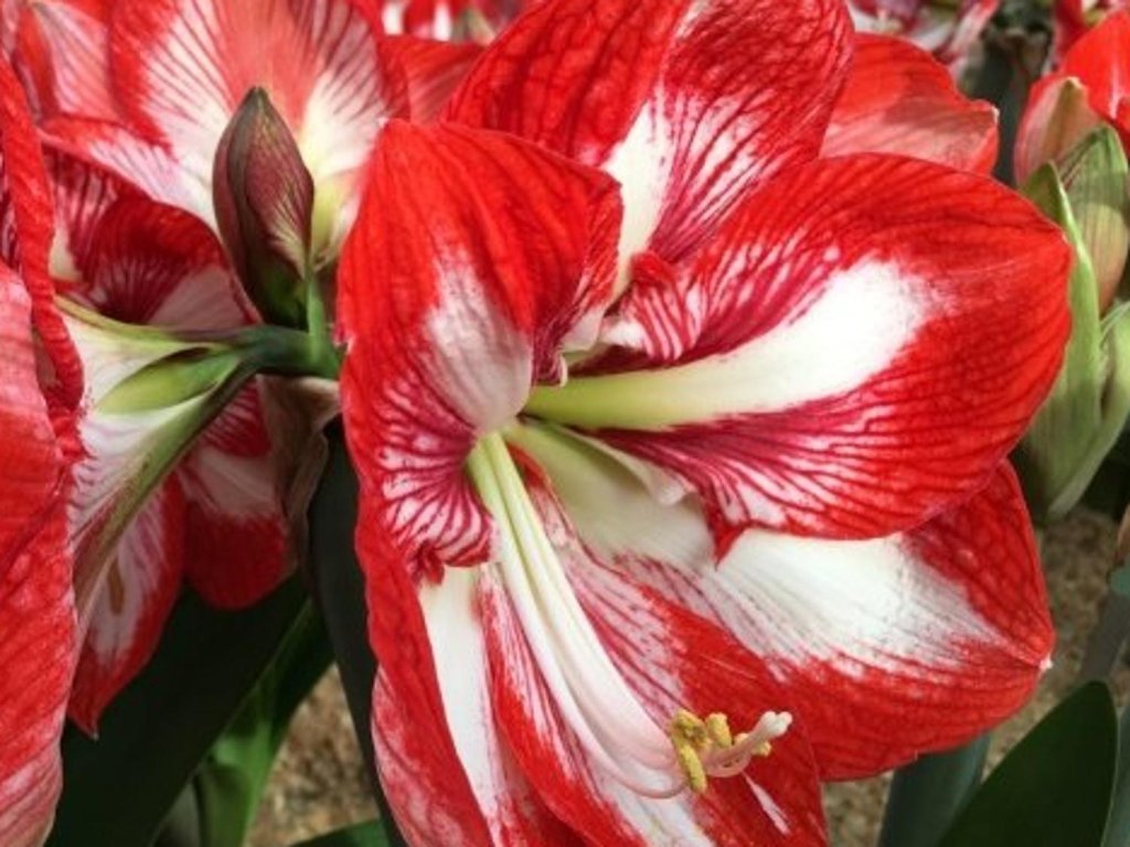 Amarylis 'Pierrot' - cibuľovina z čeľade amarylkovitých, ktorej rodičovské druhy pochádzajú z trópov a subtrópov Južnej Ameriky. Kultivar 'Pierrot' je uvádzaný v obchodnej skupine Galaxy a cenený pre čitateľné dvojfarebné kvety. Na dutom stvole vysokom približne 50–60 cm sa otvárajú 2–6 široko lievikovitých kvetov s priemerom okolo 20 cm. Okvetné plátky sú červené, každým plátkom prechádza nepravidelný biely pruh, ktorý sa v pohľade zhora skladá do hviezdice, hrdlo je zelenkavé a prašníky biele. Vôňa býva nevýrazná, kvet však drží tvar aj pri kratších dňoch a pôsobí slávnostne bez okázalosti. Stvoly je možné využiť na rez, po zrezaní sa vo váze oplatí ponechať oporu, pretože kvety sú veľké. Väčšie cibule, často predávané v obvode 36/38 cm, mávajú silu vytvoriť viac stvolov a vyšší počet kvetov. Rastlina je pri požití jedovatá, najmä cibuľa, a patrí mimo dosahu detí a domácich zvierat. Po odkvitnutí sa vytvára vejár zelených listov dlhých obvykle 30–70 cm, ktoré počas vegetácie zaberú zhruba 30–45 cm do šírky.