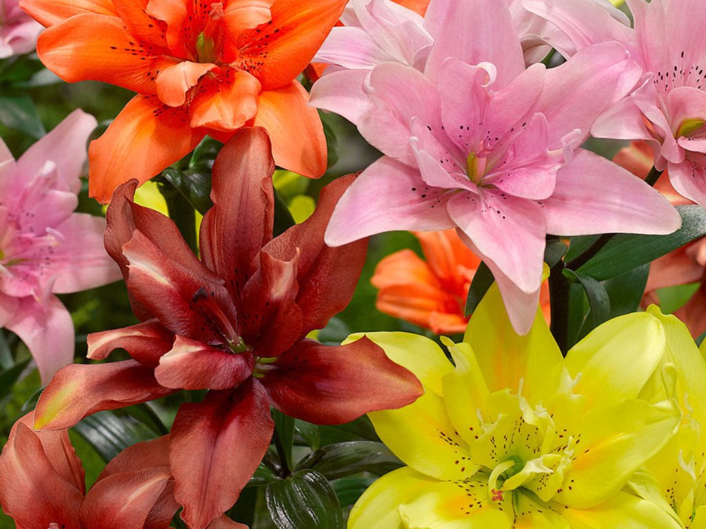 Ázijské ľalie DOUBLE - mix - ázijské ľalie v plnokvetej (double) forme predstavujú exkluzívnu variáciu tejto klasickej záhradnej rastliny. Zmes zahŕňa kvety s mnohopočetnými okvetnými plátkami, ktoré vytvárajú bohatý, takmer pivoňkovitý vzhľad. Vďaka tomu pôsobí veľmi dekoratívne a to aj bez typickej ľaliovej vône, čo je výhodou pre citlivejšie osoby alebo interiéry. Farby sú rozmanité – od jemných pastelov po sýto výrazné tóny, často s kombináciou odtieňov a jemným bodkovaním. Plnokveté ľalie dorastajú obvykle do výšky okolo 70 až 100 cm, majú pevné stonky a kvety dlho vydržia ako na záhone, tak vo váze. Vyniknú ako výrazný solitér aj v zmiešanej výsadbe.