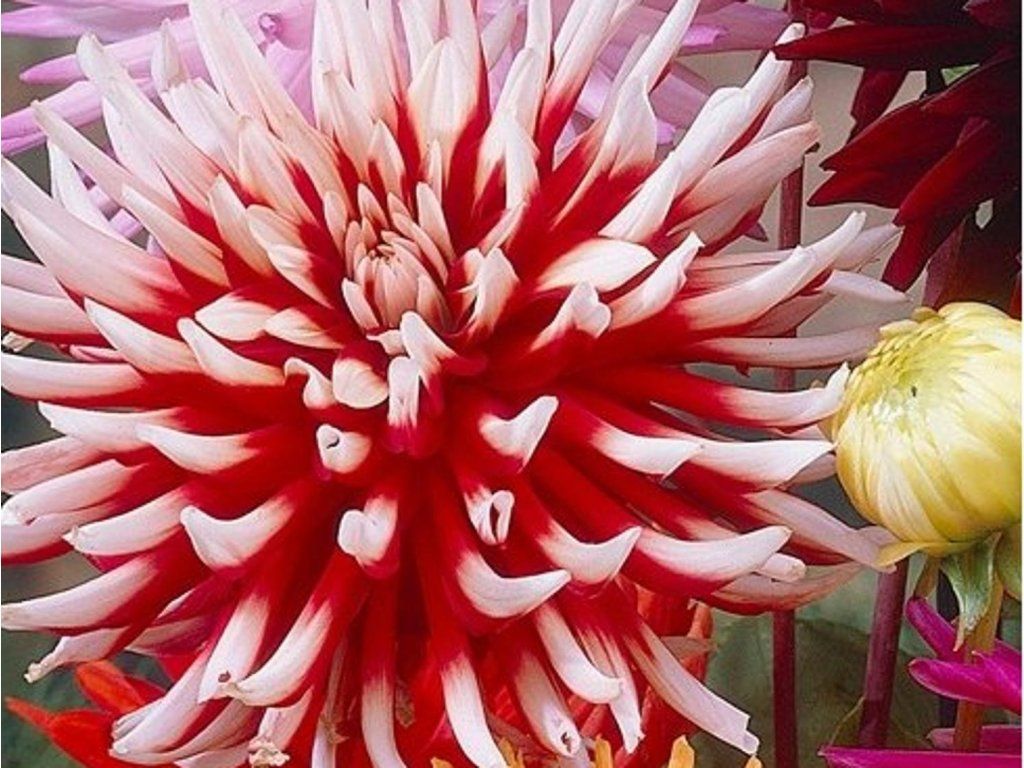 Jiřina 'Friqoulette' - nápadné veľké kvety tohto kultivaru zdobia pretiahnuté červené lístky s bielymi špičkami. Dorastá do výšky 150 cm. Nakvitá od júla do októbra. Hodí sa ako na rez, tak aj ako silitera na Vašej záhrade.