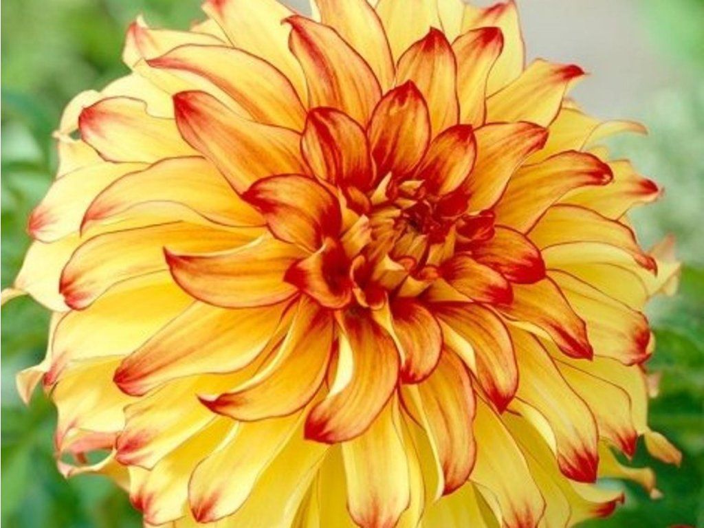 Jiřina 'Lady Darlene' - Ako slnko v lúčoch ohňa môžu pôsobiť kvety až 120cm vysokého kultivaru georgíny. Žiarivo žlté okvetné plátky majú červeno tónované špičky. Kvety sú vhodné na rez, postupne nakvitajú od júla až do októbra.