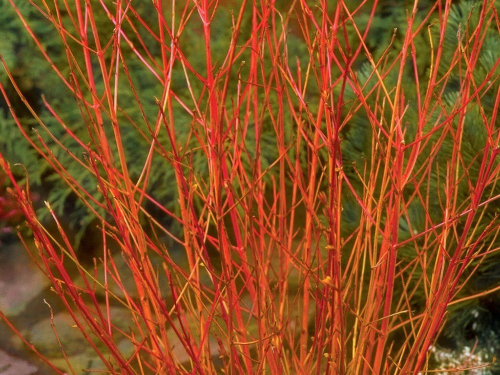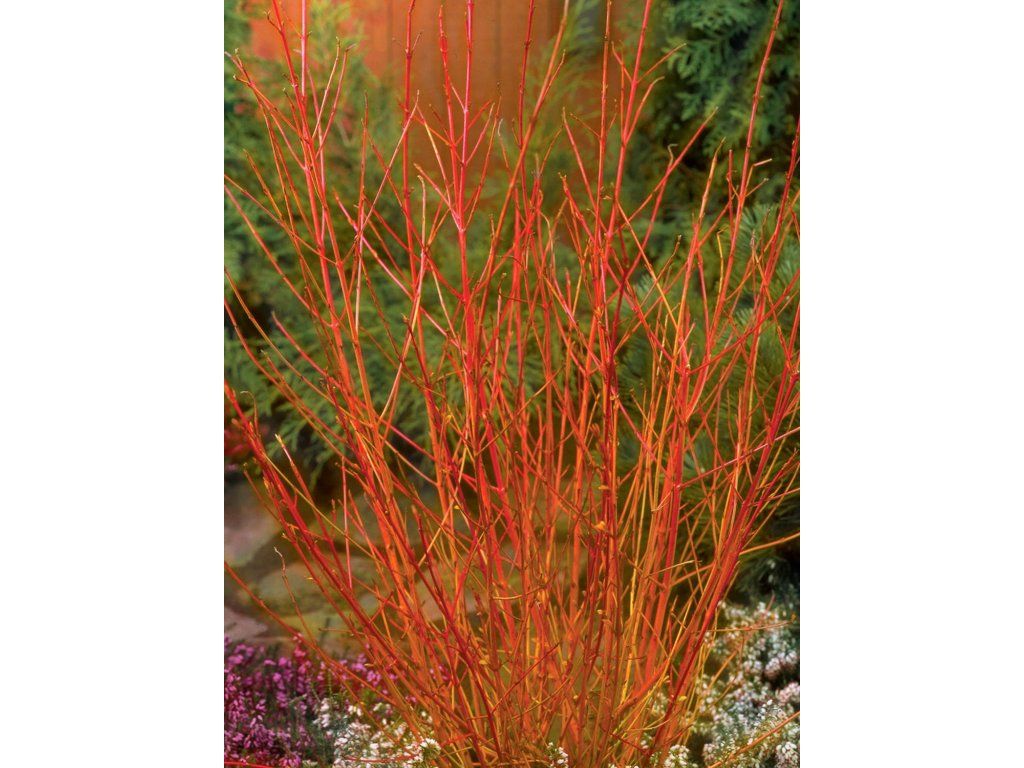 Drieň krvavý 'Midwinter Fire' - drieň krvavý patrí medzi opadavé kríky pochádzajúce z druhu pôvodného v Európe a západnej Ázii. Kultivar bol objavený v nemeckej záhrade a okolo roku 1990 uvedený do obchodu pod názvom 'Midwinter Fire', ktorý vystihuje jeho charakteristickú zimnú farbu výhonov. V našich podmienkach dorastá okolo 1,5-3 m výšky a podobnej šírky, podľa stanovišťa a spôsobu rezu. Vytvára hustý, viackmenný ker s množstvom mladých prútov. Listy sú ústretové, vajcovité až široko eliptické, počas vegetácie stredne až tmavo zelené. Na jeseň sa farbí do žltých, oranžových až červenkastých odtieňov, ktoré plynule prechádzajú vo farbu zimných vetiev. Hlavnú okrasnú hodnotu predstavujú mladé výhony - pri päte kríky sú žlté až oranžové, smerom k vrcholu prechádzajú do sýto oranžovočervenej až purpurovej, čo na snehu alebo proti tmavému pozadiu vytvára výrazný zimný efekt. V máji a júni nesie svída drobné biele kvetenstvo v plochých chocholíkoch, ktoré pokrývajú konce vetiev. Po odkvitnutí dozrievajú malé biele až modravé guličkovité plody, ktoré slúžia ako potrava pre vtáctvo. Vďaka kvetom a plodom prispieva ker k biodiverzite záhrady. V kompozíciách sa uplatní ako solitéra v trávniku, v páse pri vodnej ploche, vo voľnom živom plote alebo v skupine s ďalšími svídami a okrasnými trávami, kde vynikne hra farieb výhonov v zime.