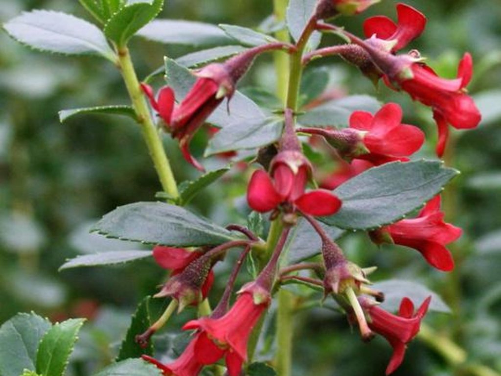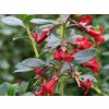 Eskalónia 'Red Elf' - stálozelený ker z čeľade eskalóniovitých (Escalloniaceae), selektovaný v Holandsku firmou PG Zwijnenburg z kríženia 'William Watson' a 'CF Ball'. Rod Escallonia pochádza z miernych oblastí Južnej Ameriky, najmä z Čile, kde rastie v krovinách na svahoch aj na pobreží so slaným aerosólom. Kultivar tvorí hustý, bohato rozkonárený habitus s oblúkovitými výhonmi a drobnými kožovitými listami, zvyčajne 2 – 4 cm dlhými, lesklými tmavozelenými a jemne pílovitými. Od júna do augusta, v teplom lete často až do septembra, nesie na koncoch výhonov krátke strapce rúrkovitých kvetov v sýtočervenom až karmínovom tóne, jednotlivý kvet má okolo 1 cm. Kvety sú nenápadne vonné alebo bez vône, ale poskytujú nektár aj peľ, preto bývajú vyhľadávané včelami a motýľmi. V dospelosti máva najčastejšie približne 1,5 – 2 m × 1,5 – 2 m, pri tvarovaní zostáva výrazne nižší. Uplatní sa ako solitér, stredový ker pri dome aj ako nízky živý plot, kde tmavé olistenie vytvára pokojné pozadie pre trvalky neskorého leta a okrasné trávy. Dobre sa kombinuje s levanduľami, šalviami, kocúrnikom a perovskiami, ktoré prevezmú rolu farby po odkvitnutí, a s okrasnými trávami, v ktorých sa karmínové kvety čitateľne opakujú. Vďaka znášanlivosti slaného aerosólu sa hodí aj do mestských a veterných stanovíšť v nížinách.