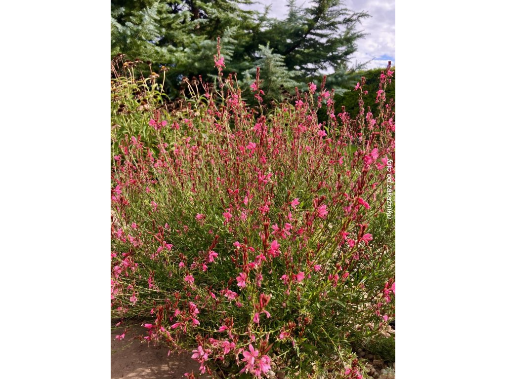 Gaura lindheimerova 'Baby Butterfly' - trsovito rastúca trvalka, ktorá sa v našich podmienkach často pestuje ako letnička. Vyniká vzdušným a jemným hábitom, drobnými podlhovastými listami a krásnymi kvetmi, ktoré tvoria veľmi dekoratívny efekt. Rastlina dorastá maximálne do výšky okolo 30 cm a rýchlo vytvára husté trsy. Listy na jar rašia neskoro a majú sýto vínovú farbu, ktorá sa postupne mení do sviežej zelenej, čím dodávajú rastline celosezónny dekoratívny charakter. Kvety sú temne ružové, objavujú sa od júna a kvitnutie pokračuje až do októbra, čím poskytujú dlhotrvajúci farebný akcent v záhrade, nádobách či trvalkových kombináciách. Kultivar 'Baby Butterfly' je nenáročný na pestovanie a skvele dopĺňa nižšie záhony či okraje trvalkových výsadieb, kde vytvára jemný, vzdušný a farebne výrazný prvok.