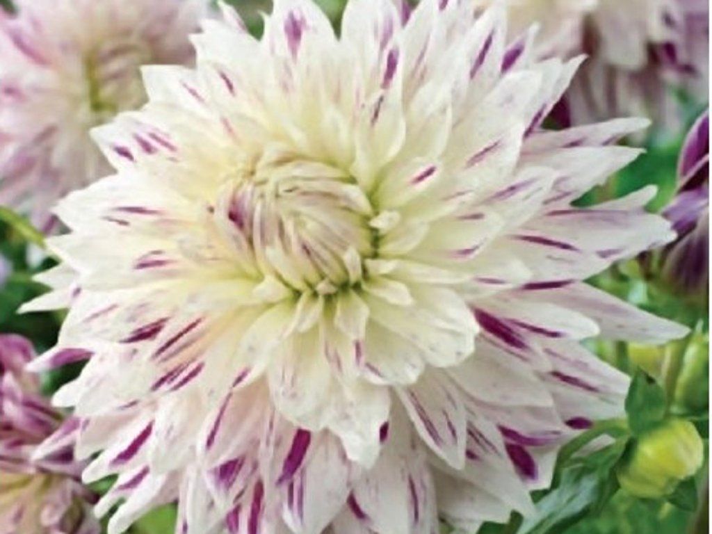 Jiřina 'Akita's Striped' - čisto biely kultivar je ozvláštnený fialovým prekreslením okvetných plátkov. Dosahuje do výšky 90cm, nakvitá ako väčšina odrôd od júla. Vhodný na rezu.