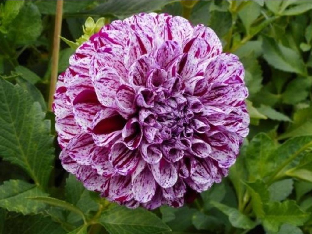 Georgína 'Marble Ball' - hľuznatá trvalka z čeľade hviezdicovitých, u nás pestovaná ako letná okrasná rastlina. Rod Dahlia pochádza z Mexika a Strednej Ameriky, záhradné hybrdy vznikli dlhodobým šľachtením pre vyrovnané kvitnutie. Kultivar sa radí medzi ball georgíny s plne dvojitými, takmer guľovitými kvetmi a pravidelne usporiadanými lístkami. Rastlina tvorí vzpriamený trs s dutými, pevnými stonkami a tmavo zelenými, sperenými listami. Od júla do októbra nesie úbory približne 7–10 cm, na bielom podklade nepravidelne žíhané až mramorované fialovou, takže žiadne dva kvety nebývajú rovnaké. Vôňa kvetov je obvykle nevýrazná. V záhrade sa uplatnia v zmiešaných letných záhonoch, v opakovaných skupinách aj vo veľkých nádobách pri terás. Farebne ladí s okrasnými trávami, šalviami, železnicami a s jednofarebnými georgínami, ktoré kresbu kvetov zvýraznia. Kvety sú vhodné na rez, vo váze pri čistej vode obvykle vydržia 5–7 dní a tvar zostáva kompaktný, čo je praktické aj pre menšie väzby.Celkovo sú georgíny krásnym prvkom do záhrad, prinášajú farbu a romantický vzhľad do každej záhrady. Rozhodne by nemala chýbať ani v tej vašej. Kvety sú vhodné na rez a kvetinové väzby.