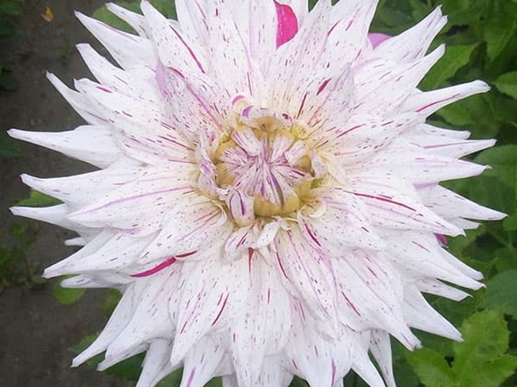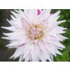 Georgína 'Mick's Peppermint' - atraktívny kultivar georgíny s plným kaktusovým kvetom.Hľuznatá trvalka z čeľade hviezdicovitých, v českých záhradách pestovaná ako letná okrasná rastlina. Rod Dahlia pochádza z Mexika a Strednej Ameriky, zatiaľ čo záhradné hybridy vznikli dlhodobým šľachtením pre vyrovnané kvitnutie a pevnejšie stonky. Kultivar bol v záhradných katalógoch uvádzaný od roku 1992 av rámci triedenia RHS patrí medzi polokaktusové georgíny. Tvoria vzpriamené trsy s dutými, pevnými stonkami a tmavo zelenými, sperenými listami. Od júla do októbra, často až do prvých jesenných mrazíkov, sa otvárajú plne dvojité kvety s priemerom približne 20–22 cm. Biely základ je nepravidelne postriekaný ružovou až purpurovou, niekedy v jemnom žíhaní, takže žiadne dva kvety nebývajú rovnaké. Okvetné lístky sú pretiahnuté a čiastočne stočené, kvet má ľahko „ihličkový“ reliéf. Vôňa býva nevýrazná. Kvety sú vhodné na rez av čistej vode obvykle vydržia 5–7 dní, preto sa uplatnia v kyticiach aj ako solitérny akcent. V záhonoch dobre ladí s okrasnými trávami, železníkmi, šalviami a jesennými astrami, kde mramorovanie kvetov pôsobí ako jemne rozptýlené svetlo.