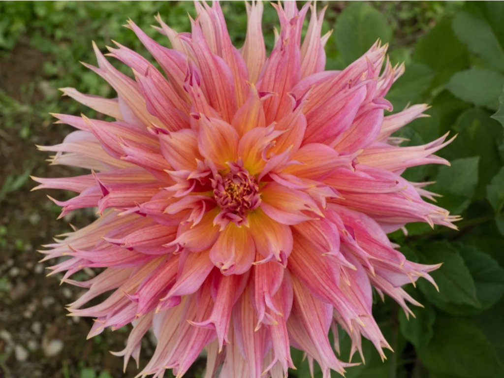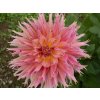 Georgína 'Omega' - krásna hľuznatá trvalka z čeľade hviezdicovitých, v českej klíme pestovaná ako letná okrasná rastlina. Rod Dahlia pochádza z Mexika a Strednej Ameriky, zatiaľ čo záhradné hybridy vznikli šľachtením na dlhé kvitnutie a pevnejšiu stavbu rastlín. Kultivar sa radí medzi strapkaté georgíny typu fimbriata, niekedy býva ponúkaný aj ako „dinnerplate“ pre výraznú veľkosť kvetu. Od júla do októbra sa otvárajú plne dvojité úbory približne 15–20 cm. Základná farba prechádza medzi marhuľovou, mangovo žltou a ružovou, často s nepravidelnými cicavcami v sýtejšej ružovej až purpurovej, takže kresba jednotlivých kvetov nebýva rovnaká. Okvetné lístky sú na koncoch jemne rozstrapkané, kvet preto pôsobí plasticky a „rozčesáva“ svetlo v záhone. Olistenie je tmavo zelené, sperené, vôňa kvetov je nevýrazná a plne dvojité kvety majú pre opeľovače len obmedzený prínos. V kompozícii sa osvedčuje spojenie s okrasnými trávami, železnicami, šalviami alebo s jednofarebnými georgínami, ktoré teplé tóny kultivaru zvýraznia. Kvety sú vhodné na rez, pri zbere v čase plného vyfarbenia a pri pravidelnej výmene vody obvykle vydržia 5–7 dní.