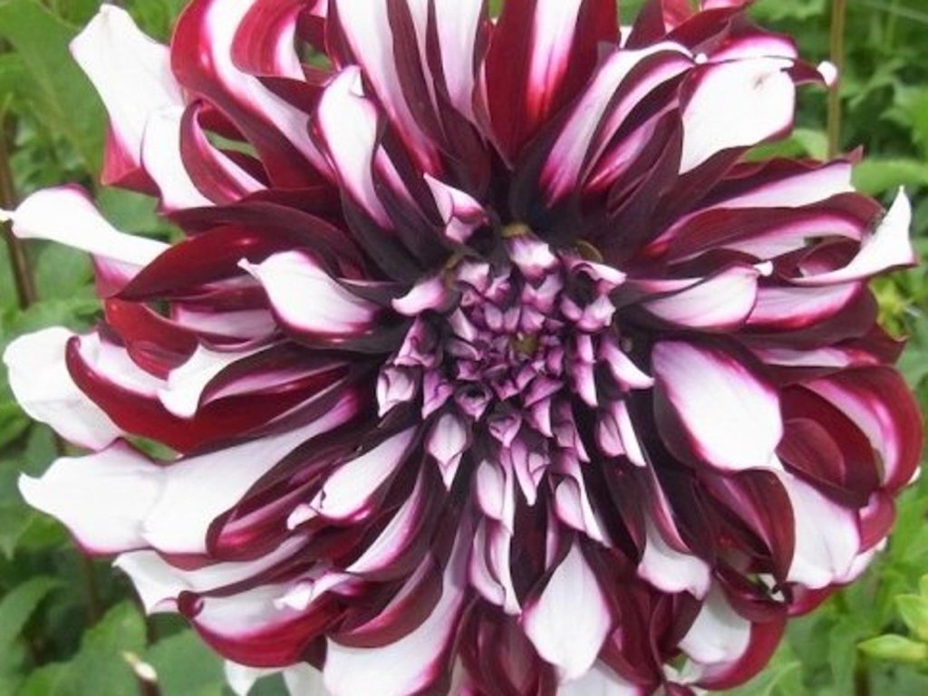 Georgína 'Tartan' - georgína patrí medzi hľuznaté trvalky pôvodom z horských oblastí Mexika a Strednej Ameriky, v českej klíme sa však pestuje ako letná okrasná rastlina. Kultivar 'Tartan' je radený medzi dekoratívne, často ako „dinnerplate“ pre veľkosť kvetu. Bol vyšľachtený na Novom Zélande šľachtiteľom Frost a do obehu sa uvádza okolo roku 1950. Vytvára vzpriamený, krovitý habitus približne 0,9 – 1,2 m vysoký a 0,6 – 0,8 m široký. Listy sú tmavo zelené, pílkovité, na pevných stonkách. Od júla do októbra nesie plné kvety s priemerom asi 15–20 cm s nepravidelnou kresbou vínovočervených okvetných lístkov a čisto bielych špičiek či lemovania. Vôňa býva nevýrazná, pri plných kvetoch je pre opeľovače dostupné množstvo peľu menšie, napriek tomu sa v teplých dňoch môžu objaviť včely aj čmeliaky. V záhradných kompozíciách dobre nadväzuje na okrasné trávy, echinacea, rozchodníky a astry, kde dopĺňa neskoro letnú farebnosť, a vyniká aj ako kvet na rez vďaka dlhým stonkám a výraznej kresbe. Na rez sa vyberajú kvety plne rozvinuté, ktoré vo váze držia dlhšie pri pravidelnej výmene vody. Kresba kvetov sa počas sezóny môže mierne premieňať, časť kvetov býva tmavšia alebo naopak svetlejšia.