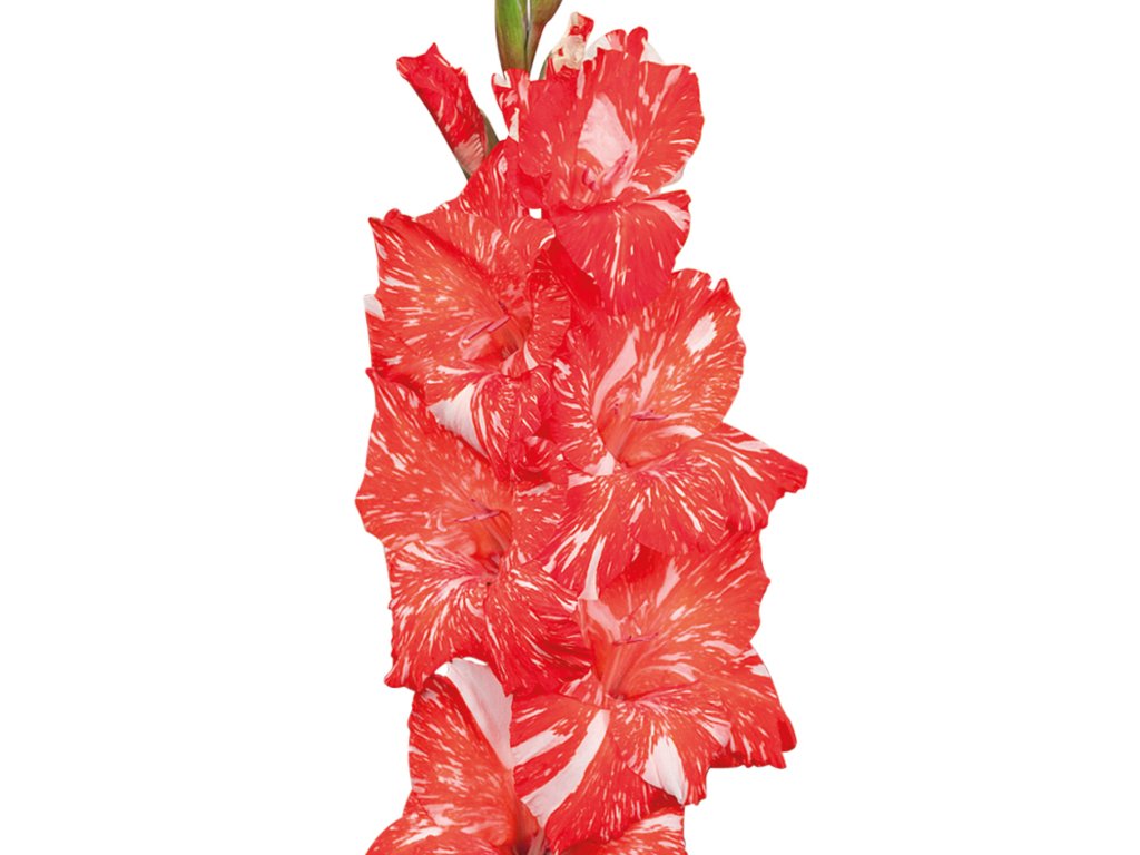 Gladiola 'Koi Pursuit' - nádherná rastlina, ktorá patrí medzi záhradné hybridy rodu Gladiolus z čeľade kosatcovitých Iridaceae. Rod Gladiolus je druhovo najbohatší v južnej Afrike a čiastočne v Stredomorí, u nás sa veľkokveté kultivary pestujú z hľúz ako letné okrasné rastliny. 'Koi Pursuit' je cenený pre takzvaný „broken“ efekt, kedy sa na bielom podklade objavujú nepravidelné karmínové šmuhy a žíhanie, takže každý kvet i celý klas pôsobia jedinečne. Listy sú úzke, mečovité, sýto zelené, na pohľad čisté a architektonické. Kvetný stvol býva pevný, vysoký približne 100-130 cm, šírka trsu sa pohybuje okolo 10-15 cm. Kvetenstvo je obvykle dvojradové a kvety sa otvárajú postupne odspodu nahor, čo predlžuje okrasný efekt aj využitie na rez. Pre väzbu sa stvoly režú vo fáze otvorenia prvého až druhého kvetu, zvyšok sa rozvinie vo váze. Vôňa je spravidla nevýrazná, napriek tomu kvety často navštevuje hmyz. V kompozícii dobre funguje v skupine po 5–9 hľuzách, medzi strapatkami, šantami, šalviami a okrasnými trávami, kde vytvára zvislú linku a výrazný farebný detail. Rastlina nie je určená na konzumáciu.