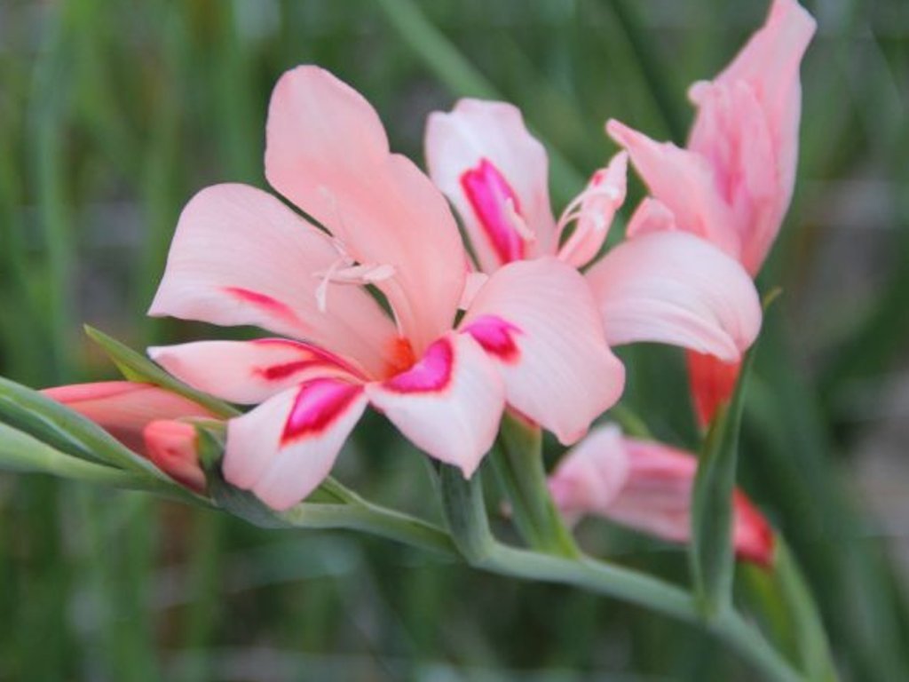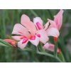 Gladiola drobnokvetá 'Impressive' - táto odolná mini verzia patrí medzi drobnokveté, časnejšie kvitnúce mečíky zo skupiny Nanus, vzniknuté šľachtením druhov juhoafrického a čiastočne aj stredomorského pôvodu. V európskych katalógoch sa často uvádza ako minigladiola z okruhu pestovateľov špecializovaných na Nanus kultivary. Z hľuzy vyrastá vejár úzkych, mečovitých listov sýto zelenej farby a nad nimi pevné kvetné stvoly. Rastlina dorastá približne 40-50 cm, v dobrých podmienkach až okolo 60 cm, pri šírke asi 15 cm, preto sa hodí aj do menších výsadieb. Od mája do júla nesie voľnejší klas lievikovitých kvetov v jemne ružovej farbe, ktoré zdobia sýtejšie ružovočervené až malinové kresby, často sústredené len na jednej polovici kvetu. Kvety sa na klase otvárajú postupne odspodu, takže dekoratívny efekt trvá dlhšie a vo váze sa rozvíjajú ďalšie puky. V kompozícii sa uplatňuje v prednej až strednej partii záhonu medzi trvalkami s jemnou textúrou a okrasnými trávami, napríklad so šantou, železníkom alebo prosom, kde kresba kvetov pôsobí ľahko a pritom čitateľne. Hľuzy nie sú jedlé a pri požití môžu byť problematické pre deti aj domáce zvieratá.
