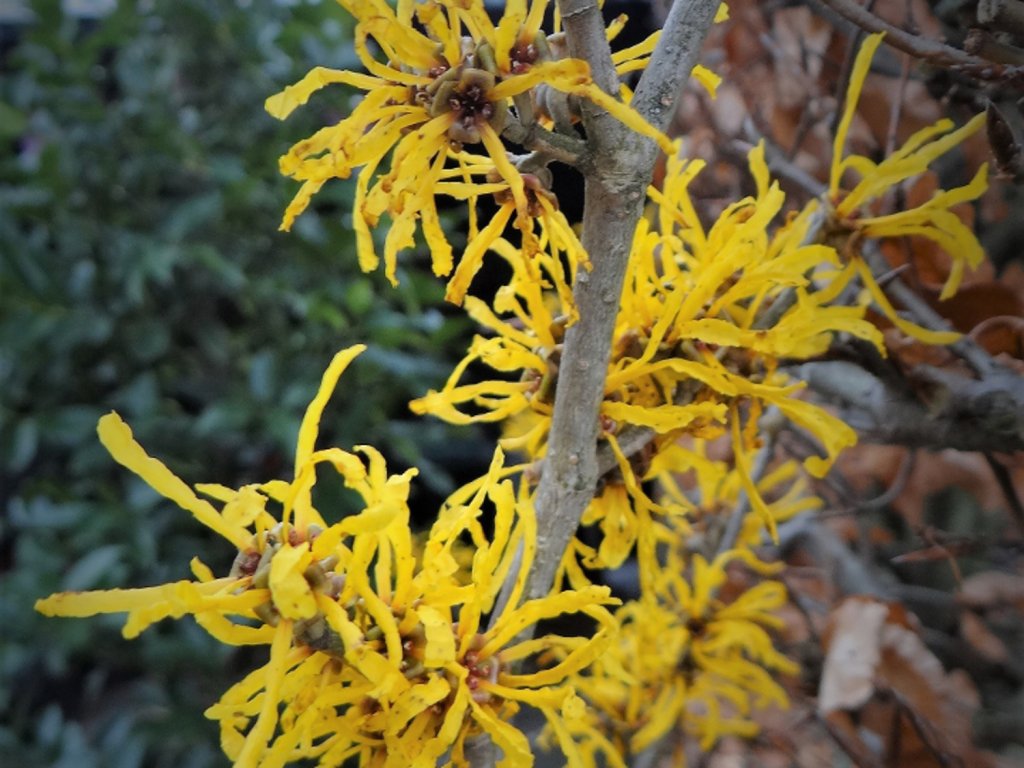 Hamamel prostredný 'Evi' - elegantný a menej rozšírený okrasný kultivar hamamelu, cenený pre svoje teplé žlté kvety v zimnom období, jemnú vôňu a výrazné jesenné sfarbenie listov.Patrí medzi veľmi atraktívne zimne kvitnúce kríky, ktoré dokážu oživiť záhradu v období vegetačného pokoja.Rastie ako opadavý, pomaly rastúci ker, obvykle 2 až 3 metre vysoký, často aj podobne široký. Habitus je vzpriamený až široko rozložitý, s prirodzene tvarovanou, elegantnou korunou. Listy sú široko oválne, sýto zelené, na jeseň sa vyfarbujú do výrazných tónov žltej, oranžovej a červenej, čo zaisťuje vysokú okrasnú hodnotu aj mimo doby kvetu.Kvety sa objavujú od januára do marca, často už uprostred zimy. Sú tvorené typickými úzkymi, skrútenými páskovitými korunnými lístkami. Farba kvetov je sýto žltá až medová, veľmi teplá a žiarivá, s jemnou, príjemnou vôňou. Kvety sú odolné voči mrazu, pri silnom chlade sa stiahnu a po oteplení sa znovu roztvoria. Uplatní sa predovšetkým ako solitérny ker, kde vynikne jeho zimné kvitnutie, napríklad pri vstupoch, na pohľadových miestach záhrady alebo v reprezentatívnych častiach pozemku. Veľmi dobre sa kombinuje s ďalšími kríkmi s okrasným jesenným efektom alebo so stálezelenými drevinami.