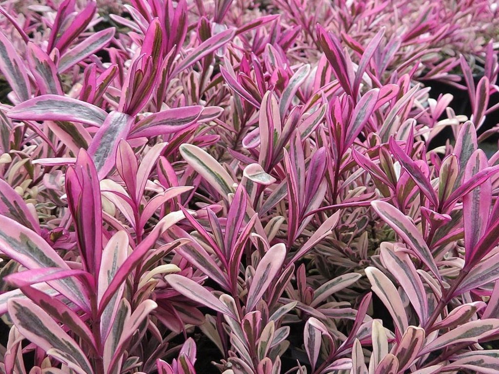 Hebe 'Burning Heart' - fascinujúci a vizuálne veľmi dynamický kultivar, ktorý do rodiny hebe vnáša nečakane farebnú dramatiku. Je to kompaktný, vždyzelený ker guľovitého tvaru, ktorý v dospelosti dosahuje výšku aj šírku okolo 40 až 60 centimetrov. Rastie husto a úhľadne, čo z neho robí ideálnu rastlinu pre detailné kompozície, kde hrá prim textúra a farba listu. Listy sú u tohto kultivaru naprosto unikátne – sú úzke, kopijovité a majú sýto šedozelený stred s veľmi výrazným, nepravidelným krémovým okrajom. To najzaujímavejšie sa však deje pri rašení a v chladnejších mesiacoch: mladé výhony a okraje listov sa farbia do žiarivo ružovej až purpurovej, čo vytvára efekt, akoby rastlina „horela“. S príchodom zimy sa tento ružový nádych ešte zintenzívňuje. Kvety sa objavujú v priebehu leta a skorého podzimu v podobe drobných strapcov svetlofialovej až levanduľovej farby. Hoci sú pôvabné a lákajú opeľovače, u tohto kultivaru plnia skôr doplnkovú úlohu k jeho farebnému olisteniu. Tento kultivar sa uplatní predovšetkým ako výrazný prvok v nádobách, korytách alebo na okrajoch zmiešaných záhonov a vresovísk.