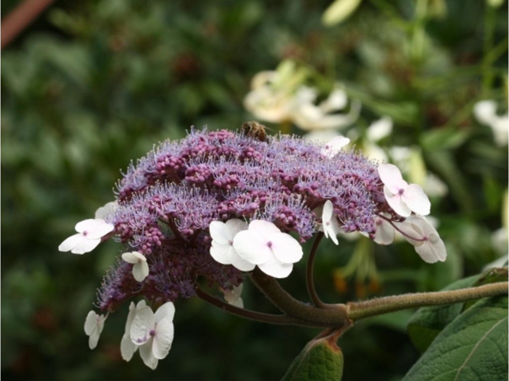 Hortenzia drsná 'Macrophylla' - pochádza z horských a podhorských oblastí Číny a Himalájí. Kultivar 'Macrophylla' patrí k veľkokolistým formám, ceneným pre veľmi veľké listy, často 20-30 cm dlhé, s jemne zubatým okrajom a plstnatým rubom. V lete sú tmavo zelené, na jeseň sa môžu posúvať do žltých tónov a po opadaní vynikne pevné, ľahko chlpaté vetvenie. V záhradách vytvára nepravidelne rozložitý, viackmenný solitér a obvykle dorastá 2–3 m na výšku aj do šírky, niekedy viac v teplejších polohách. Od júla do augusta sa na koncoch výhonov objavujú plošné kvetenstvá, často 15–25 cm široké. Uprostred drobné fertilné kvety v ružovo až fialovo modrých odtieňoch a na okraji väčšie sterilné kvietky, ktoré kreslia jemný lem. Farebnosť sa môže mierne meniť podľa reakcie pôdy. Kvety sú atraktívne pre včely a čmeliakov, výrazná vôňa sa väčšinou neprejavuje. V kompozícii pôsobí prirodzene s rododendrony, papradiami, bohyškami a jarnými cibuľovinami, dobre nadväzuje aj na hortenzie latnaté a na tmavozelené ihličnany, kde vynikne listová textúra aj krajkové kvetenstvo.
