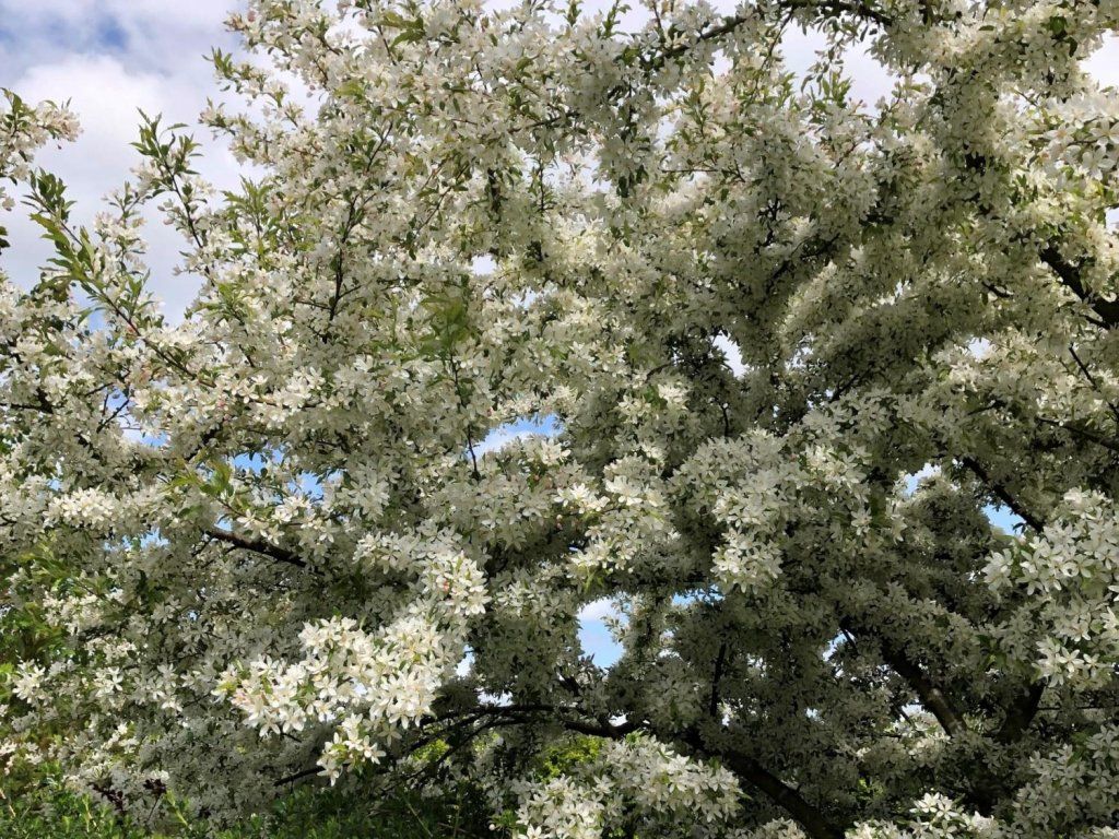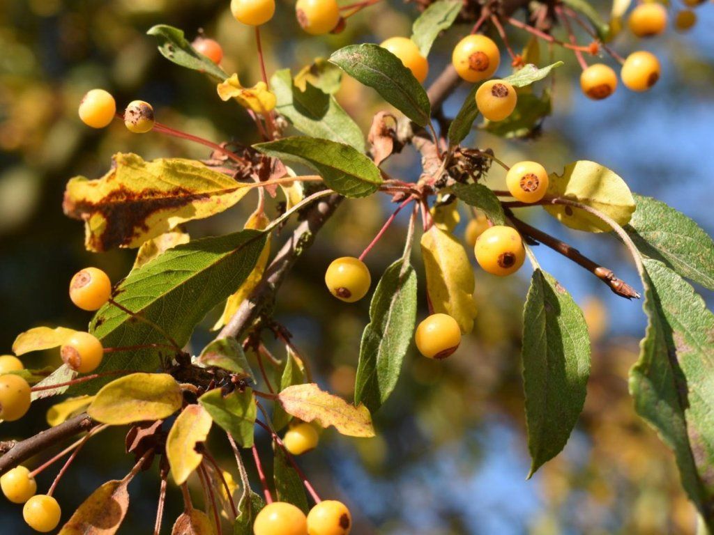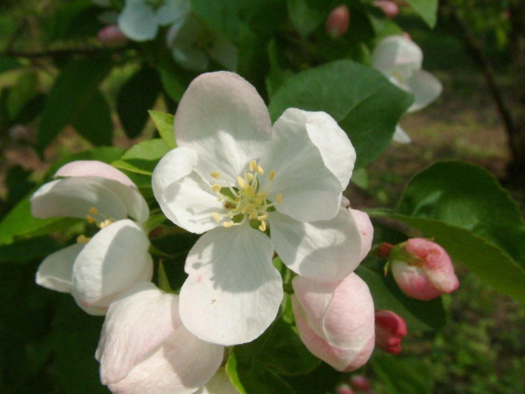 Jabloň prechodná - tvorí menší, rozložitý strom či ker, v dospelosti dorastajúci do výšky 8m. Na jar sa zo svetloružových púčikov rozvíjajú čisto biele jednoduché kvety so šiestimi až ôsmimi lupeňmi. Doslova obsypú celý strom. Plody sú drobné, guľovité. Majú žltú farbu. Sú jedlé, ale vďaka svojej veľkosti vhodné skôr pre vtáctvo a pod. Listy sú úzke, podlhovasté, majú zelenú farbu. Na jeseň sa sfarbujú do medovo žltej.
