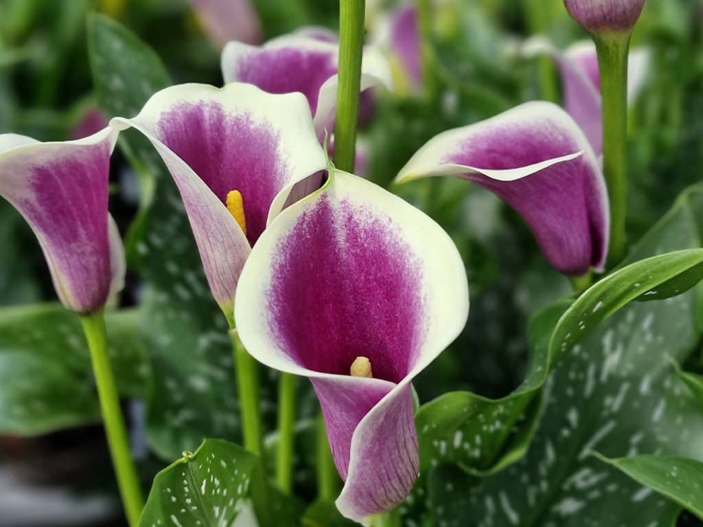 Kala 'Picasso' - jeden z najpôvabnejších a najžiadanejších kultivarov, ktorý vytvára stredne veľké krémovo biele kalichy s tmavo purpurovým až fialovým stredom. Vykvitajú nad sýto zelenými, kopijovitými listami a priťahujú pozornosť svojou výraznou farebnou hrou. Rastlina dosahuje približne 40–60 cm na výšku aj šírku, čo ju robí vhodnou na pestovanie v nádobách na terasách aj v skupinových záhonoch ako kontrastný akcent. Kvitne od júna do septembra a jej dvojfarebné kvety pôsobia efektne v spoločnosti bielych alebo pastelových letničiek a nízkych trvaliek. Hľuzovité podzemky nie sú odolné voči mrazu av zimnom období sa odporúča ich vybratie a prezimovanie v suchu a teple. Obsahuje dráždivé látky, preto sa neodporúča do priestorov s malými deťmi a domácimi zvieratami.