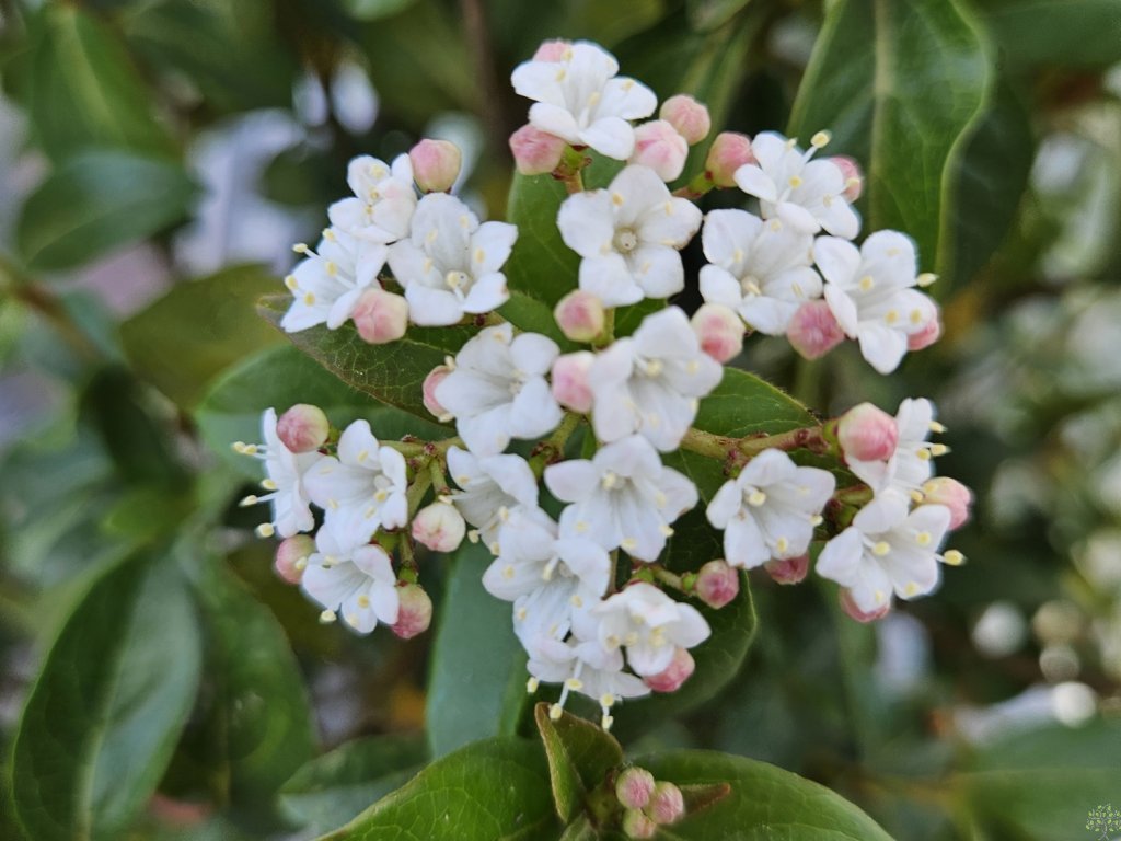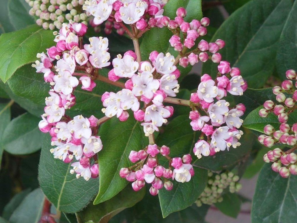 Kalina vavrínová 'Eve price' - veľmi obľúbený a osvedčený okrasný kultivar vždyzelenej kaliny, cenený pre svoj celoročný dekoratívny vzhľad, bohaté jarné kvitnutie a nápadné plody. Patrí medzi najspoľahlivejšie kultivary kaliny vavrínovej pre záhrady aj mestské výsadby. Rastie ako stredne veľký, hustý a vzpriamený ker, obvykle 2 až 3 metre vysoký a približne 1,5 až 2,5 metra široký. Habitus je kompaktný a dobre vetvený, ker pôsobí upravene a elegantne aj bez pravidelného rezu. Listy sú veľké, kožovité, tmavo zelené a lesklé, svojim vzhľadom pripomínajú listy vavrínu a zostávajú na rastline po celý rok. Kvety sa objavujú v apríli až máji. Sú drobné, biele až jemne ružovkasté, usporiadané v plošných vrcholových kvetenstvách. Kvitnutie je bohaté a pôsobí veľmi elegantne, kvety majú jemnú, nenápadnú vôňu a lákajú opeľovače. Po odkvitnutí sa tvoria nejedlé dekoratívne plody, ktoré sú spočiatku červené, neskôr tmavnú až do čiernej. Plody často na kríku vydržia dlho a výrazne zvyšujú okrasnú hodnotu rastliny. Je dobre mrazuvzdorný, najmä na chránených stanovištiach. Uplatní sa ako solitéra, do živých plotov, kríkových skupín, tienistých kútov záhrady, k plotom aj k stenám domov. Vďaka stálezeleným listom je cenný ako celoročná clona a pozadie pre iné okrasné rastliny.