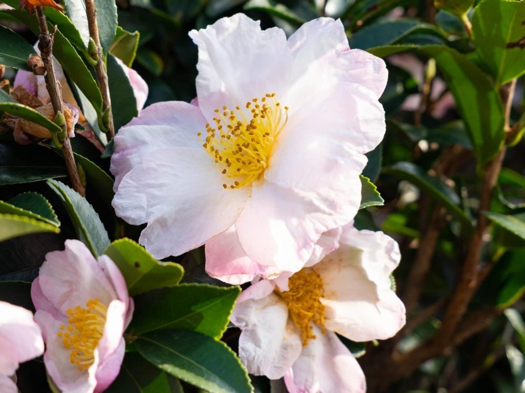 Kamélia sasanková 'Hino De Gumo' - vzpriamený, vždyzelený, opadavý krík s tmavozelenými, lesklými listami. Dorastá do výšky 2-2,5 m. Má veľké, jednoducho tvarované kvety čisto bielej farby alebo s občasným ružovkastým nádychom. Kvitnú od novembra do jari.