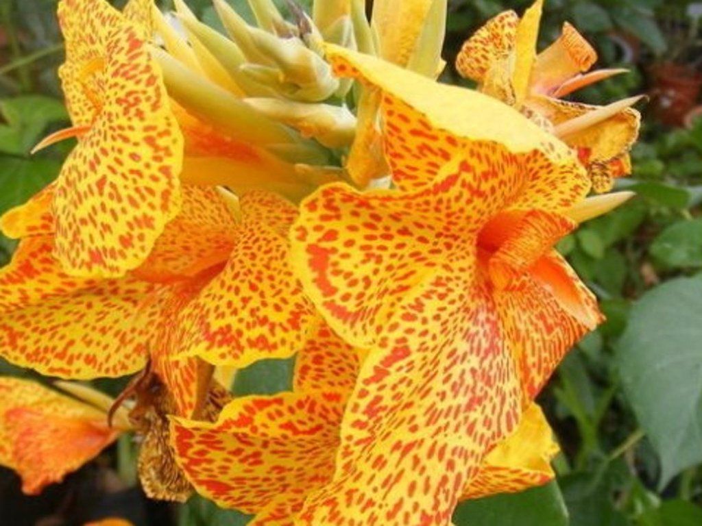Kana 'En Avant' - závan exotiky prináša tento kultivar vďaka tehlovo oranžovým škvrnám so žiarivo žltým pozadím. Veľké listy sú jasne zelené. Narastá do výšky 90cm a kvitne od júna do októbra.