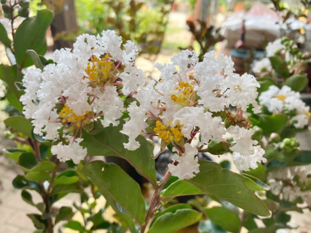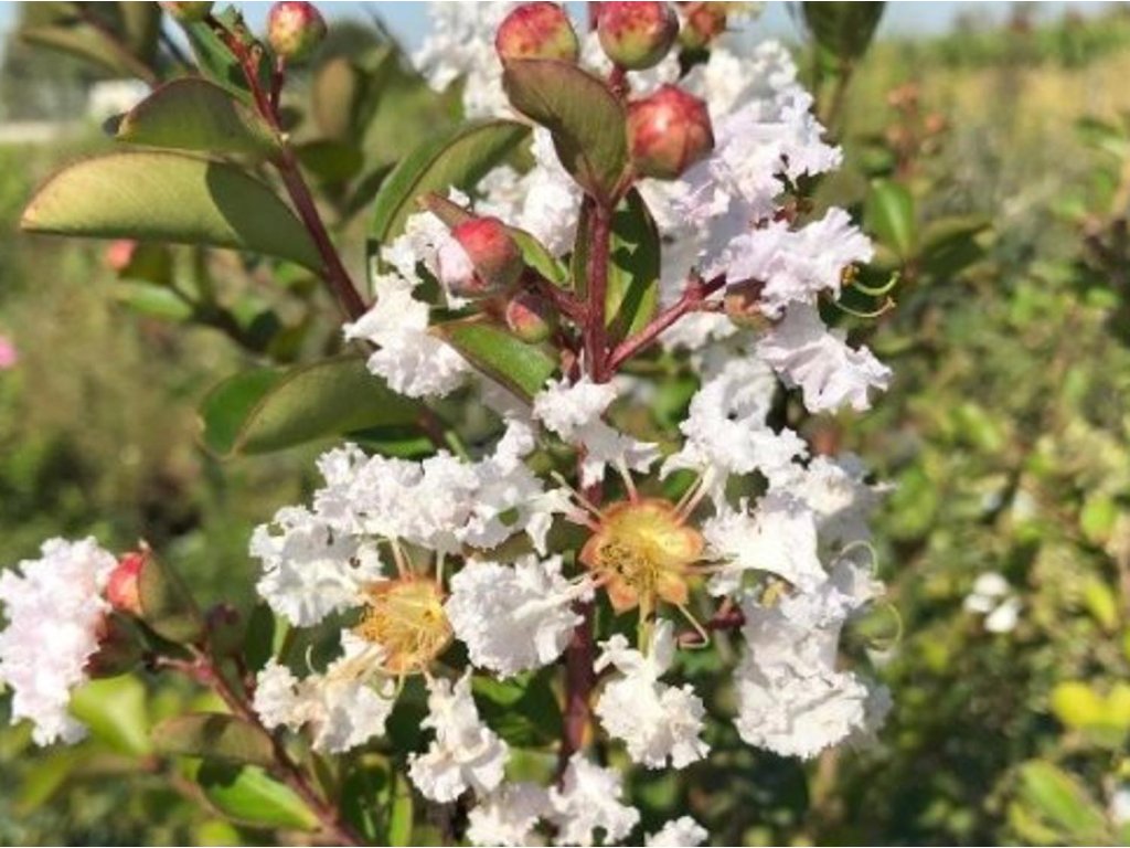 Lagerstroemia 'Nivea' - pochádza z teplejších oblastí Ázie a pre kvalitné kvitnutie potrebuje dlhé, teplé leto. Kultivar 'Nivea' je bielokvitnúci výber cenený pre čistý tón kvetov a výraznú, hladkú borku, ktorá sa v dospelosti odlupuje v tenkých plátoch a odkrýva oranžovo-škoricové odtiene. Habitus je rozložitý, v dospelosti približne 3 m vysoký a okolo 2 m široký, v teplejších polohách môže rásť aj ako menší viackmenný strom. Listy sú oválne, 3 – 5 cm dlhé, v lete tmavozelené, na jeseň prechádzajú do oranžových až červených tónov. Kvitnutie začína neskôr, obvykle v priebehu augusta, kedy sa na koncoch tohtoročných výhonkov objavujú kužeľovité súkvetia dlhé zhruba 15 – 20 cm s krepovo zvlnenými, čisto bielymi okvetnými lístkami a žltými tyčinkami. Po odkvitnutí sa tvoria drobné tobolky, ktoré zasychajú dohneda a môžu na vetvách vytrvať aj cez zimu. Biely odtieň kvetov pôsobí pokojne a dobre vyniká večer, preto sa kultivar často uplatňuje pri posedeniach, na terasách a v predzáhradkách. V kompozícii vyniká pred tmavšou zeleňou ihličnanov, s okrasnými trávami a s trvalkami v bielo-zelenej palete.