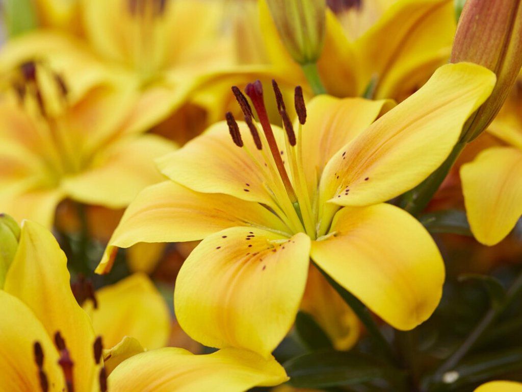 Ľalia 'Golden Joy' - žiarivé zlato pripomínajú kvety tejto zakrpatenej ľalie, ktorá dosahuje do výšky iba 30cm. Žlté okvetné plátky dopĺňa jemný oranžový nádych vychádzajúci zo stredu kvetu, spoločne s jemným bodkovaním. Nakvitajú od júla. Ideálne na výsadbu do nádob.