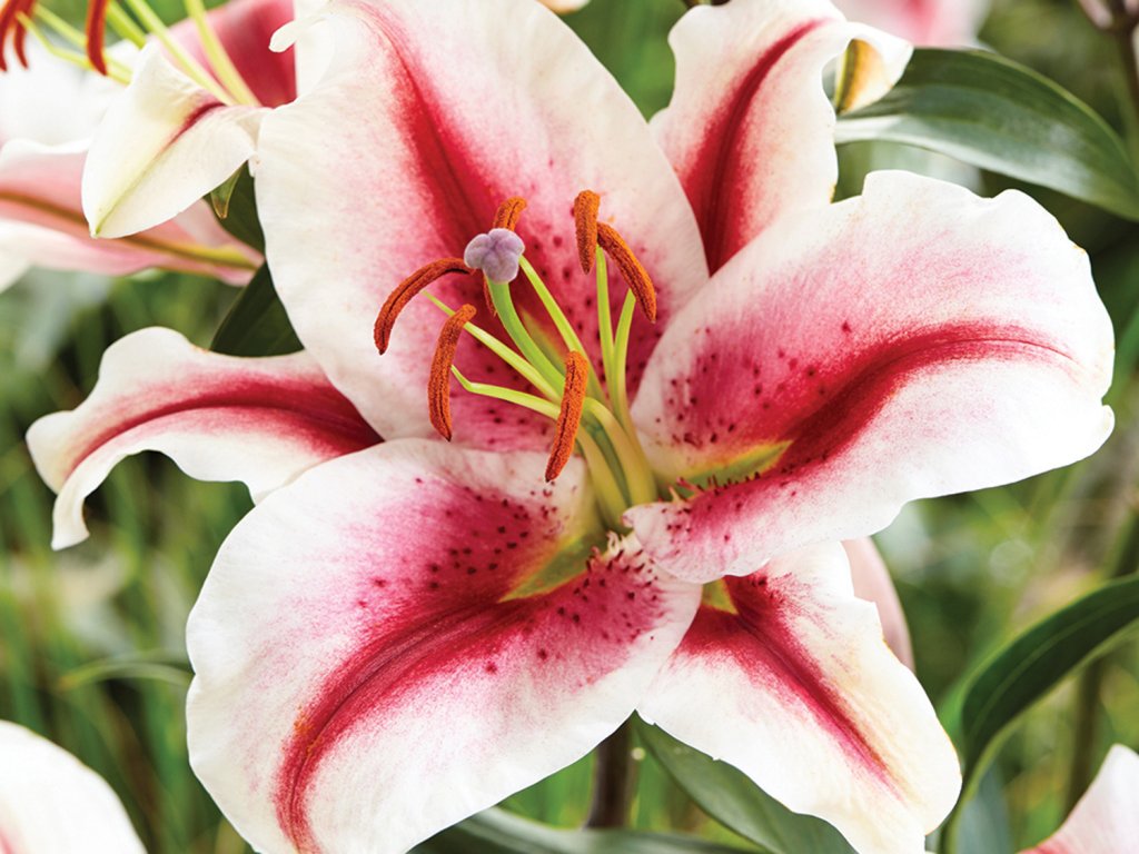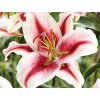 Ľalia 'Hachi' - dvojfarebný kultivar, ktorý patrí do skupiny orientálnych hybridov, ktorých pôvod nadväzuje na druhy Lilium auratum a Lilium speciosum z Japonska. Vytvára priame stvoly vysoké približne 90–120 cm s úzkymi, lesklo zelenými listami v pravidelných praslenách a počas sezóny tvoria výrazný zvislý akcent. V júli až auguste sa na vrchole stvolu otvára obvykle 3–6 veľkých kvetov s priemerom zhruba 14–16 cm, pri vyzretých cibuliach býva pukov viac. Okvetie je snehovo biele, stredom každého plátku prechádza široký tmavočervený až mahagónový pruh a okolo neho sa objavuje jemné bodkovanie. Prašníky nesú sýty peľ, ktorý sa v aranžmánoch často odstraňuje kvôli škvrnám na textile. Vôňa je výrazná, najlepšie sa rozvíja navečer, keď kvety pôsobia ako tichý maják v záhone. Kultivar sa uplatní v zmiešaných trvalkových výsadbách, v zadných partiách záhona aj v nádobách pri posedení, kde sa vôňa drží v teplom vzduchu. Dobre sa kombinuje s okrasnými trávami, šantou, šalviou hájnou a denivkami, ktoré zvýraznia biel okvetia a predĺžia sezónu efektu. Na rez je vhodný vďaka pevným stvolom a postupnému rozkvitaniu pukov, vo váze sa jednotlivé kvety striedajú v niekoľkých dňoch. Rovnako ako iné ľalie obsahuje látky dráždivé pri požití, preto je vhodná základná opatrnosť v domácnostiach s deťmi a zvieratami.