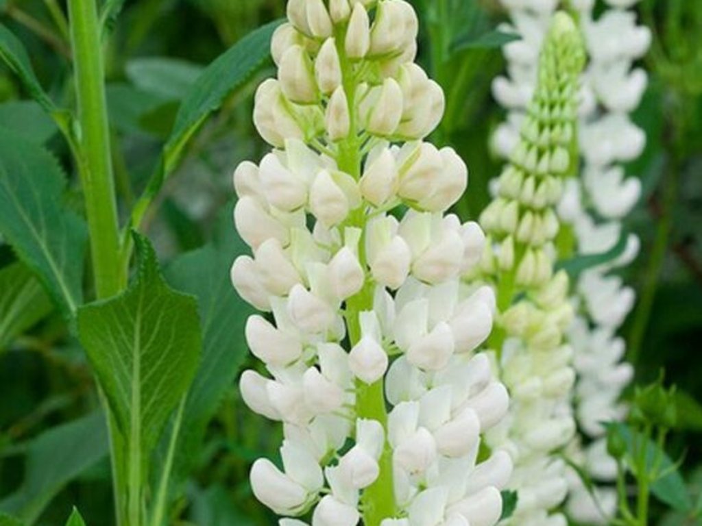 Lupina 'Noble Maiden' - je trvalka vysoká 90–120cm s bielymi kvetmi kvitnúcimi v júni a júli. Má pevné stonky, tmavo zelené listy a rastie na slnku aj v polotieni v priepustnej, mierne kyslej pôde. Je mrazuvzdorná a atraktívna pre opeľovače, ale jedovatá.
