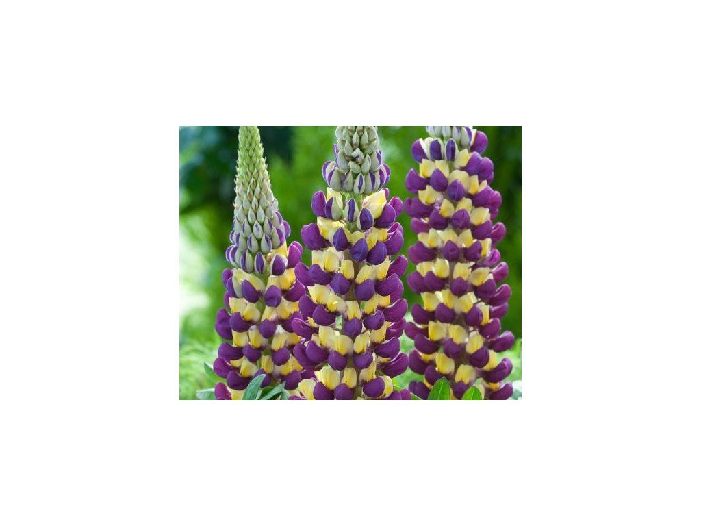 Lupina 'Purple/Yellow' - pestrofarebný kultivar so vzpriamenými hrotmi plných drobných kvietkov v fialovej a žltej, tvoriaci tak výrazný a pôsobivý kontrast. Dorastá do výšky 60 cm. Nakvitá od júla do neskorého leta. Atraktívna rastlina pre medonosný hmyz.