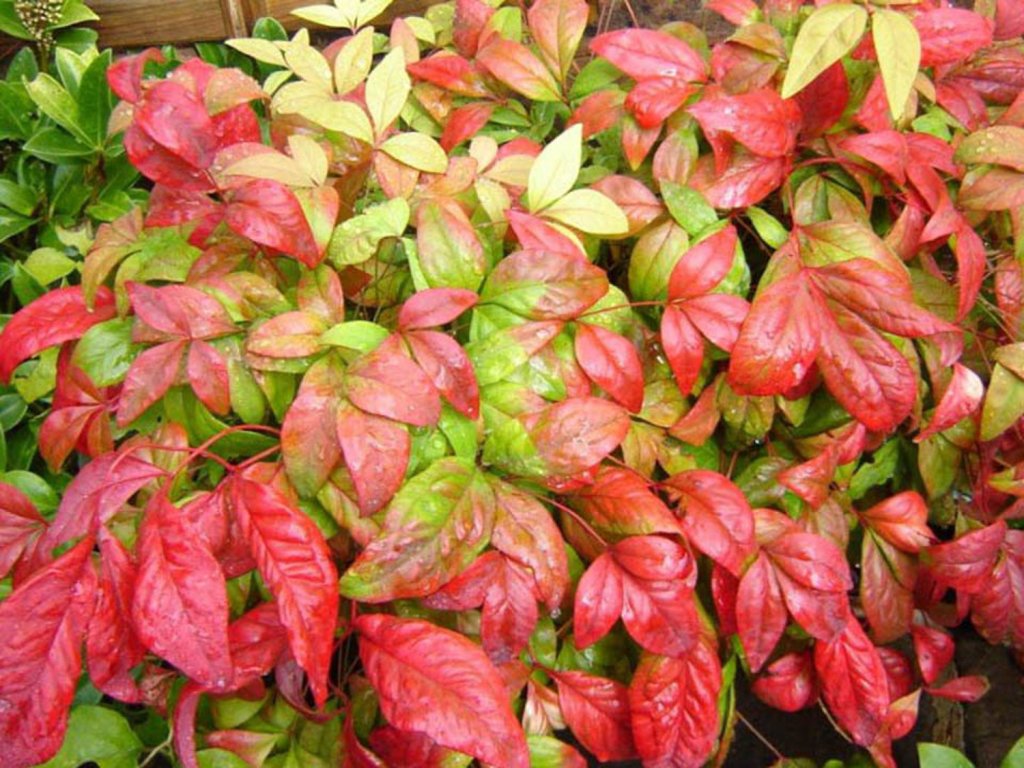 Nandina domácí 'Fire Power' - syn. nebeský bambus.Nízky, kompaktný kultivar okrasného kríka, ktorý sa pestuje predovšetkým pre svoje atraktívne listy s bohatým sezónnym spektrom farieb a jemnými letnými kvetmi. Tento vždyzelený až poloopadavý ker dosahuje obvykle výšku okolo 30 – 60 centimetrov a šírku približne 50 – 80 centimetrov, čo ho robí vhodným do menších záhrad, ako solitér či do skupinových výsadieb v predzáhradkách a skalničkových záhonoch. Listy sú lichosperené a elegantne zložené, na jar av lete bývajú kombináciou svetlo až stredne zelenej s nádychmi červenej, postupne na jeseň av zime sa sfarbujú do jasne červených až oranžových tónov, čím poskytujú výrazný vizuálny efekt aj v chladnom období. V lete sa objavujú drobné biele kvety usporiadané vo vzpriamených latách, po ktorých rastlina mnohokrát vytvára malé lesklé červené bobule, ktoré dopĺňajú zimnú farebnú scénu. Tieto bobule a tiež listy obsahujú látky, ktoré sú toxické pri požití ľuďmi aj zvieratami, preto je pri umiestnení v blízkosti domácich miláčikov potrebná opatrnosť. Nevytvára výrazne rozvetvené drevo, ale skôr hustý, nízky trs jemnej textúry, hodí sa tak aj do nádob.