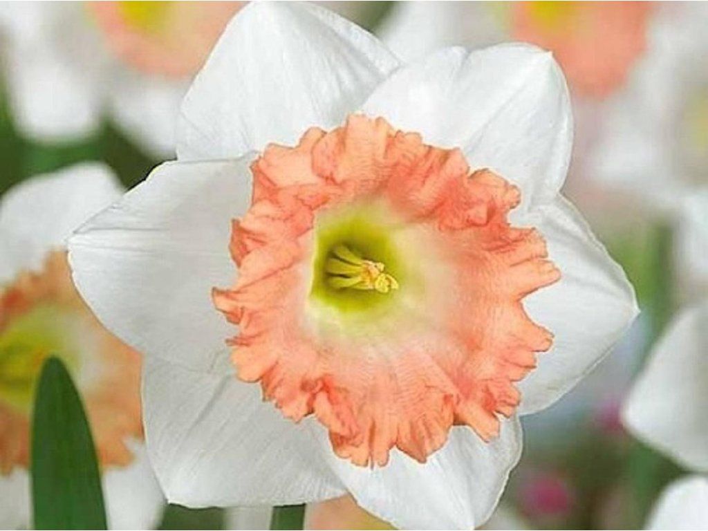 Narcis 'British Gamble' - narcis s bielymi okvetnými lístkami, korunka je krémová s nazberkanými a ružovými okrajmi. Pôsobí veľmi nežne. Dorastá do výšky 45 cm. Kvitne na jar, od marca do mája.