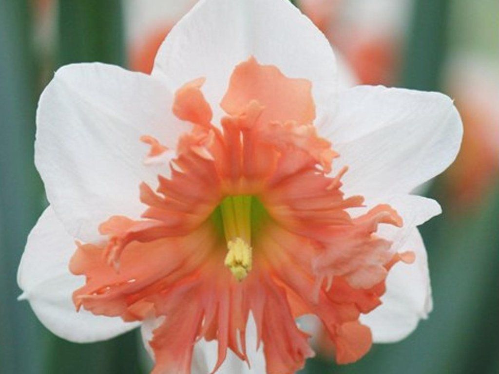 Narcis 'Shrike' - unikátne prefarbenie, ktoré sa výborne dopĺňa. Spodné okvetné plátky sú snehovo biele. Vnútorné okvetné plátky sú pri okrajoch znateľne zvlnené a majú koralovo ružové zafarbenie, samozrejmosťou sú žlté prašníky. Dorastá do výšky 35 cm. Nakvitá v priebehu apríla. Listy sú sviežo zelené, úzke a podčiarkujú krásu okvetia.