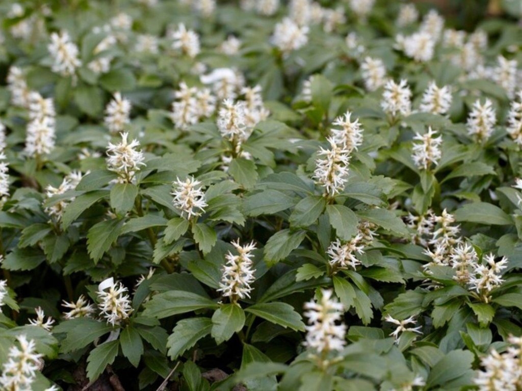 Pachysandra vrcholová - vždyzelená nízka trvalka tvoriaca hustý plazivý koberec tmavo zelených, lesklých listov s jemne pílovitým okrajom, ktoré udržujú dekoratívny charakter počas celého roka. Tento druh dorastá približne 15-30 cm na výšku a pri dostatku priestoru sa môže rozprestrieť do šírky okolo 0,60 – 1 m i viac, postupne vytvárajúce súvislú pôdopokryvnú masu vhodnú na zakrytie zatienených plôch, podrastov drevín alebo medzi vyššími stálezelenými kríkmi. Listy sú krátko stopkaté a striedavé so svetlo až tmavo zelenou farbou, ktorú si udržujú aj počas miernych zimných podmienok, hoci pri priamom slnku alebo strese môžu mierne zožltnúť. Na jar, obvykle počas marca až apríla sa nad listami objavujú drobné biele kvety na krátkych vrcholových klasovitých výhonkoch, ktoré nie sú dominantné, ale pridávajú jemný sezónny detail. Je veľmi odolná voči chladu a mrazom, je vždyzelená a tolerantná voči nízkemu osvetleniu, čo ju robí ideálnou pre trvalé pokrytie pôdy v čiastočnom až hlbokom tieni, kde iné rastliny môžu mať problém s rastom. Vďaka svojej schopnosti utvoriť súvislý zelený koberec je užitočná na potlačenie burín a stabilizáciu pôdy na svahoch. Na dosiahnutie súvislej pokrývky sa odporúča vysádzať rastliny v spone okolo 30 × 30 cm, aby v priebehu niekoľkých rokov vyplnili priestor.