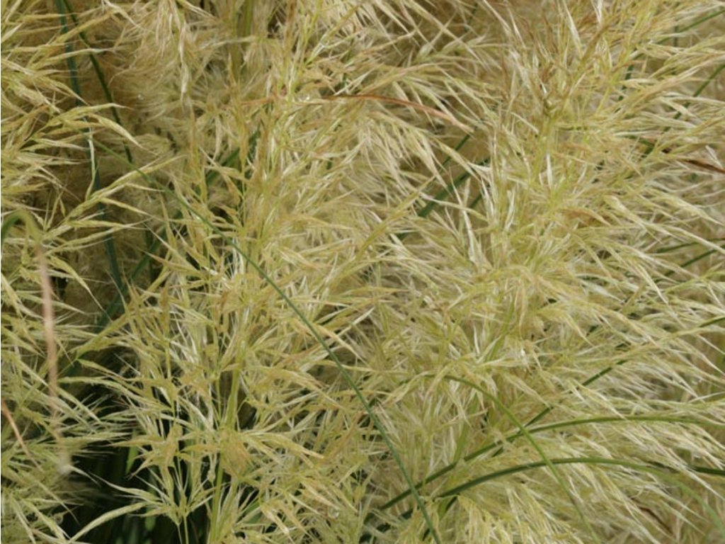 Pampová tráva 'Mini Pampas' - kompaktný kultivar známej pampovej trávy, ktorý je ideálny pre menšie záhrady, nádoby alebo miesta, kde nie je priestor. Dorastá do výšky okolo 60-100 cm. Na konci leta a začiatkom jesene vytvára atraktívne, husté krémovo biele až svetlo striebristé laty, ktoré môžu pripomínať chocholy, sú veľmi dekoratívne a vhodné aj na rez do sušených aranžmánov. Listy sú šedozelené a úzko pretiahnuté. Krásne kontrastuje s kvitnúcimi trvalkami alebo ihličnanmi.