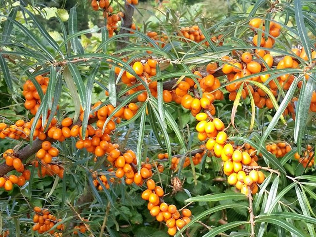 Rakytník rešetliakový 'Garden's Gift' - neobvykle plodný a esteticky veľmi vydarený kultivar rakytníka rešetliakového má svoj pôvod v divo rastúcich populáciách Eurázie. Táto konkrétna odroda bola vyšľachtená so zámerom spojiť vysokú úrodnosť s kompaktnejším rastom a menším množstvom tŕňov, čo ju robí oveľa prívetivejšou pre pestovanie v bežných rodinných záhradách. V záhrade vytvára stredne vysoký, opadavý ker, ktorý obvykle dorastá do výšky medzi 2,5 a 3,5 metrami. Jeho habitus je hustý a prirodzene skôr vzpriamený, s pevnými vetvami, ktoré pod ťarchou plodov v neskorom lete tvoria malebné previsy. Listy sú úzke, kopijovité a majú špecifickú striebristo sivú až sivozelenú farbu, ktorá rastline dodáva jemnú, takmer stredomorskú textúru. Doba kvitnutia pripadá na apríl a máj. Ide o samičiu odrodu, takže pre bohatú úrodu je nevyhnutné mať v blízkosti aj opeľovača (samčiu rastlinu). Plody dozrievajú v priebehu augusta a septembra. Sú to sýtooranžové, oválne bobule s vysokým obsahom vitamínov, ktoré na kríku držia veľmi pevne a dlho. Rastlina je mimoriadne mrazuvzdorná, bez problémov znáša teploty klesajúce k –35 °C a je veľmi odolná voči suchu aj zasoleniu pôdy. Uplatnenie nájde v úžitkových aj okrasných častiach záhrady. Vďaka striebristému olisteniu vynikne ako netradičný solitér, ale je tiež vynikajúcou voľbou pre tvorbu voľne rastúcich, jedlých a ťažko priechodných živých plotov. Skvele spevňuje svahy a prosperuje aj v chudobnejších, piesočnatých pôdach.