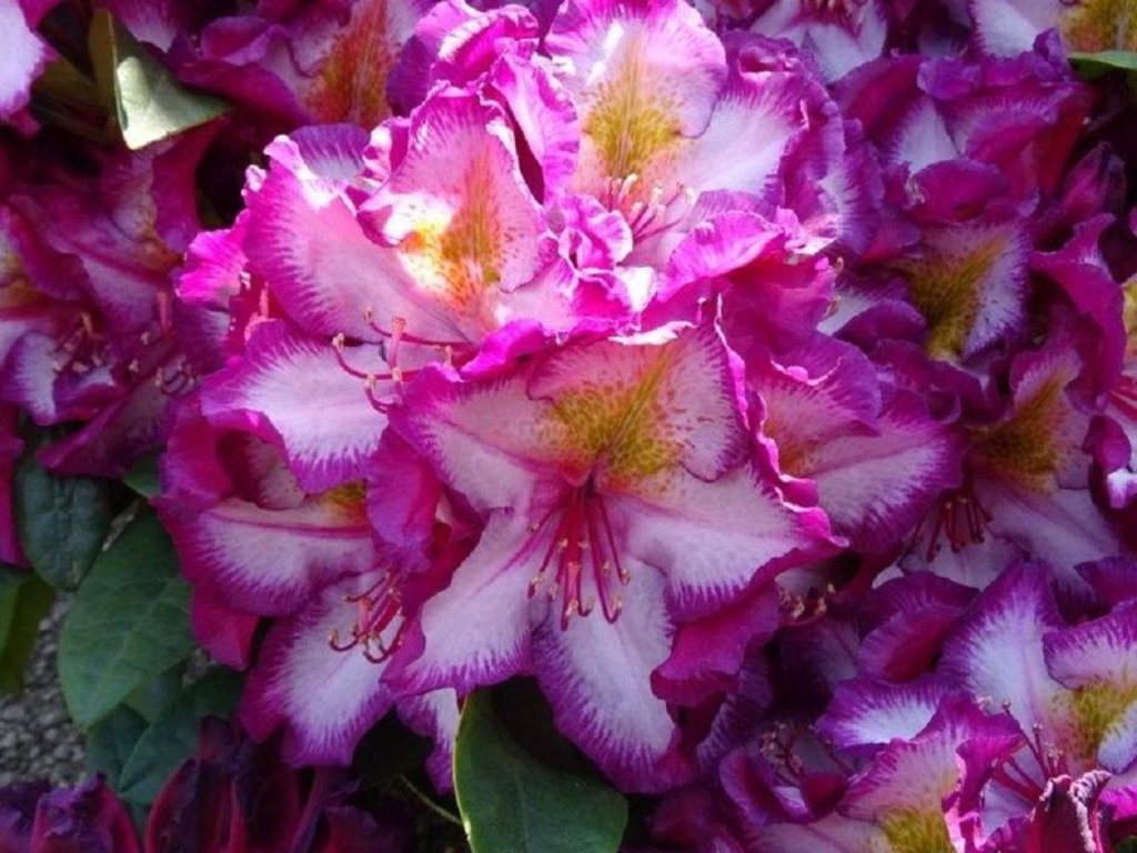 Rododendrón 'Pushy Purple' - úplne očarujúce kultivar rododendronu v sýto ružových odtieňoch tvoriaci vždyzelený, nenáročný ker dorastajúci do výšky 125-150cm v priebehu desiatich rokov. Šírka sa pohybuje okolo 140cm. Kvety sa rozvíja z červeno-fialových pukov; neskôr majú purpurovo fialové kvety so žiarivo bielym vnútrom a žltým stredom. Nakvitajú od konca mája do polovice októbra. Veľkou špecialitou tohto rododendronu je, že nevyžaduje kyslé pH pôdy, a teda je možné použiť aj na stanovištiach bez použitia rašeliny.