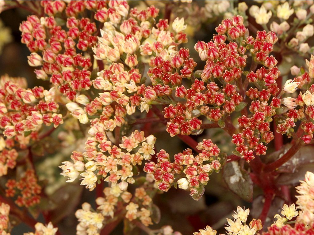 Rozchodník Sedum 'Peach Pearls' - krásny a elegantný kultivar trvalky tvoriace bochníčky so širokými oválnymi, olivovo zelenými listami, ktoré na oslnenie majú tmavo vínovo červený preliv. V polovici leta začne kultivar tvoriť dymovo ružové okolíky pukov. Kultivar sa radí medzi odrodu opadavých rozchodníkov. V čase kvetu dorastá až do výšky 45cm a šírky 60cm, je ale bežné, že sa v polovici júna skráti o polovicu. Úžasné na tomto druhu je, že medonosná vďaka tomu ponúka bohatú včeliu potravu, kvitnúť vydrží až mesiac a pol. Peach pearls je plne mrazuvzdorná a to až do -34 °C.
