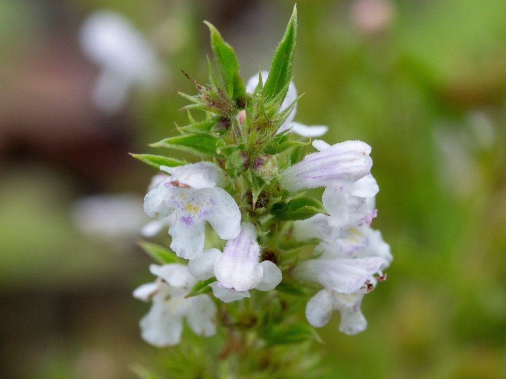 Saturejka horská - vytrvalý aromatický poloker z čeľade hluchavkovitých, pôvodom zo suchých, kamenistých strání a svetlých porastov Stredomoria a juhovýchodnej Európy. Vytvára kompaktné, husto rozkonárené kríčky s drevnatou bázou, ktoré v našich podmienkach dorastajú zvyčajne 20–40 cm do výšky a 30–50 cm do šírky. Listy sú úzke, protistojné, tmavozelené až sivozelené a pri pošúchaní uvoľňujú korenistú vôňu s nádychom korenia. Od júla do septembra nasadzuje drobné kvety v krátkych klasoch, najčastejšie biele až svetlofialové, ktoré pôsobia jemne, ale poskytujú nektár a patria k vyhľadávaným zdrojom pre včely. V kuchyni sa používajú mladé konce výhonkov a listy, čerstvé aj sušené, najmä k strukovinám, omáčkam a mäsám; chuť je výraznejšia než u saturejky záhradnej. V pletivách sa nachádzajú silice bohaté na fenolické zložky, ktoré stoja za typickou arómou; tradičné bylinkárstvo ju poznalo ako korenie aj bylinu bez zdravotných tvrdení. V záhone tvorí nízky, vždyzelený lem, ktorý pekne kontrastuje s levanduľou, šalviou či trávami a v zime drží štruktúru aj farbu. Vôňa je výrazná, kvety skôr nenápadné, hlavný okrasný efekt robí textúra drobných lístkov a striebristý nádych na slnku.