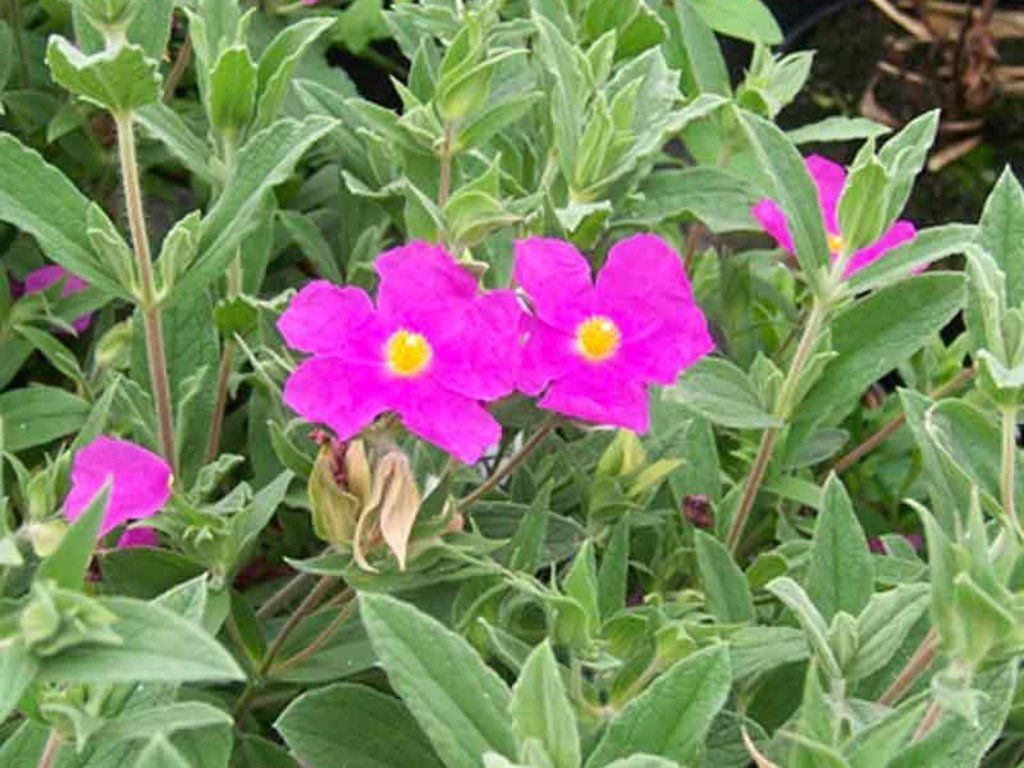 Skalné ruže - pôvabná rastlina známa najmä v oblasti Stredozemného mora. Jedná sa o malý, vždyzelený ker s mäkkými listami a výraznými kvietkami. Listy sú kožovité, šedozelené. Nakvitá od júna do augusta tmavo ružovými kvetmi so zlatožltými kvetmi. Jedná sa o vždyzelený krík dorastajúci do výšky okolo 60 cm. Odporúčame pestovať ako prenosnú rastlinu, zvláda mrazíky iba do -6 °C.