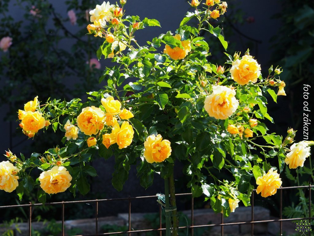 Stromková ruža 'Lizzy Starlet Rose' - moderný mini pnúci kultivar z nemeckého šľachtenia Rosen Tantau, zaradený do radu Starlet® Roses. Patrí medzi tzv. miniclimbery, ktoré vytvárajú husto olistený ker s pružnými výhonkami vhodnými na vyväzovanie, takže dobre pokrýva nižšie pergoly, obelisky aj ružové oblúky bez toho, aby potreboval veľký priestor ako bežné pnúce ruže. V podmienkach SR dorastá obvykle 1,5 – 2,0 ma asi 0,8 – 1,0 m do šírky podľa rezu a výživy. Od júna do októbra opakuje kvitnutie vo vlnách, kvety 4–6 cm sú miskovité až rozetovité, husto plné a nesené v menších kvetenstvách. Sfarbenie prechádza v oranžových až žltých tónoch a na lesklom, stredne až tmavo zelenom olistení pôsobí pokojne aj v podvečernom svetle. Vôňa je sladká, ovocná a najlepšie sa uvoľňuje za teplých dní. Stonky nesú bežné tŕne, kvety vyhľadávajú včely aj ďalšie opeľovače. Kultivar je cenený pre veľmi dobrý zdravotný stav a býva uvádzaný s ocenením TASPO Award. Ponúkaná je tiež v stromkovom variante na kmienku, ktorá vytvára efektnú kvitnúcu korunu pri vstupe, na terase alebo v menších predzáhradkách. V kompozícii sa osvedčuje susedstvo plamienkov, levandule, šanty, šalvie, pakostov a jemných okrasných tráv, ktoré zvýraznia neobvyklý odtieň kvetov a dodajú výsadbe ľahkosť.Ponúkame v stromčekovej variante na kmienku.