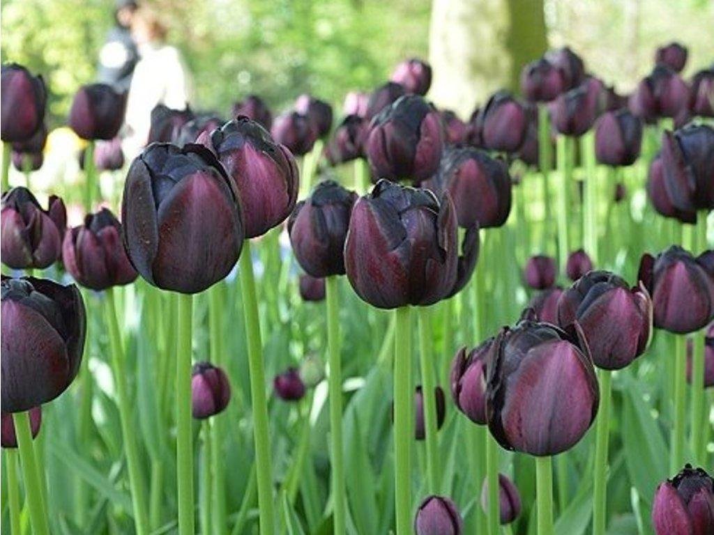 Tulipán 'Black Hero' - pomerne neskôr kvitnúci kultivar s intenzívne tmavo fialovými až červenými kvetmi. Poloplné kvety pripomínajú vzdialene pivonky. Nakvitajú v priebehu mája, niekedy až začiatkom júna. Kvitne dlho na pevných, silných stonkách a veľmi často sa používajú ako rezané kvety. Dorastajú až do 60 cm výšky a dobre odolávajú vratkému jarnému počasiu.