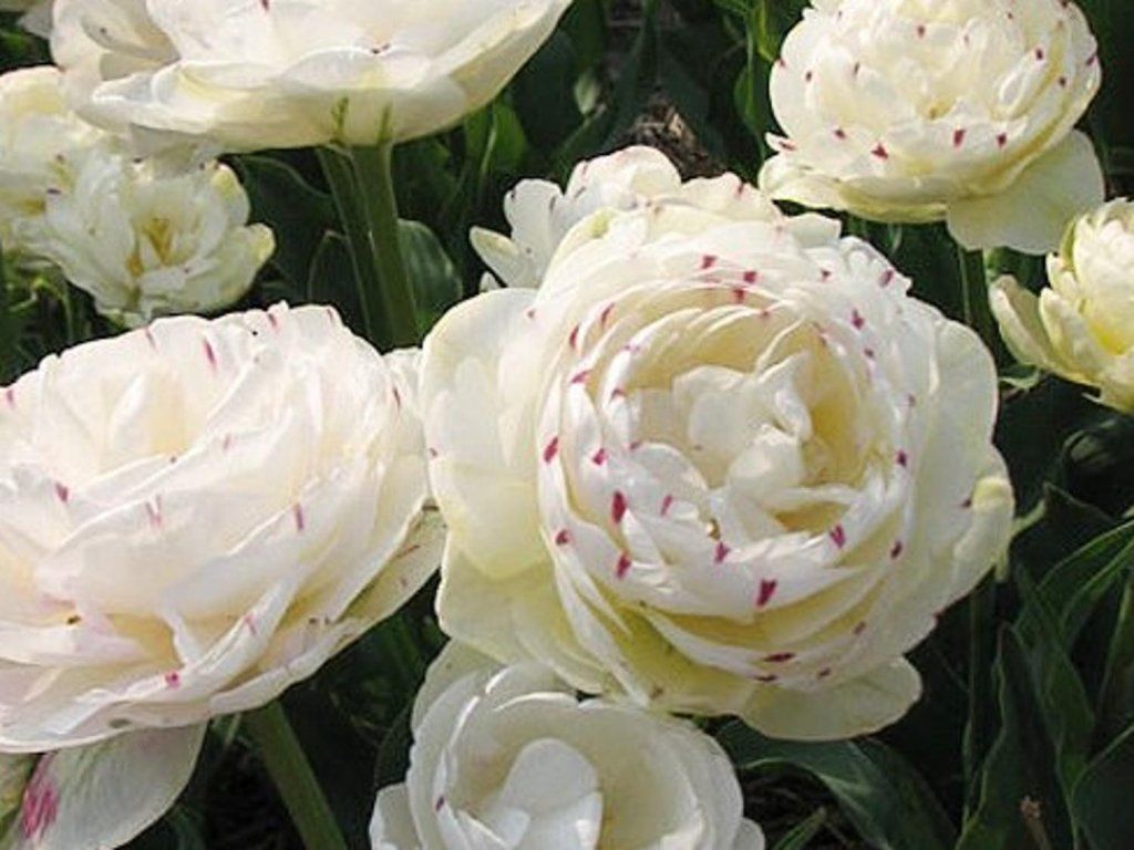 Tulipán ´Dance Line´ - biely a plnokvetý tulipán, ktorý Vás ihneď zaujme ružovými škvrnami, ktoré sú po celom kvete. Dorastá do výšky 40 cm. Kvitne v máji.