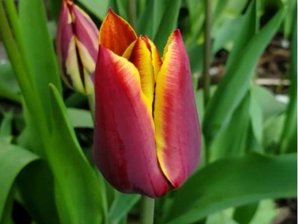 Tulipán 'Doberman' - kvety majú pohárikovitý tvar, sú gaštanové až hnedo-červené a ich okraje sú lemované žltou farbou. Kvet je jednoduchý. Dorastá do výšky okolo 50 cm, kvitne v priebehu apríla a mája. Stonky sú silné, odolajú vetru a dažďu, sú vhodné na rez.