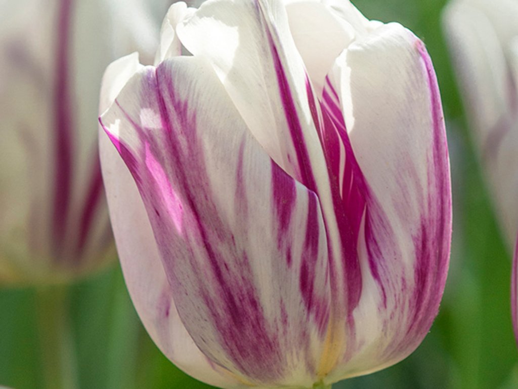 Tulipán 'Flaming Flag' - veľmi elegantný a pestrý druh obľúbeného tulipánu, ktorý dorastá do výšky 45 - 50 cm. Veľké kvety vyrastajúce na robustných stonkách sa objavujú od apríla do mája. Ich slonovinovo biela farba je obohatená o levanduľovo fialové panašovanie.Kvety skvele kontrastujú s trsom sviežo zelených listov. Tento tulipán rozžiari akúkoľvek skupinovú výsadbu cibuľovín a kvety sú ideálne na rez.