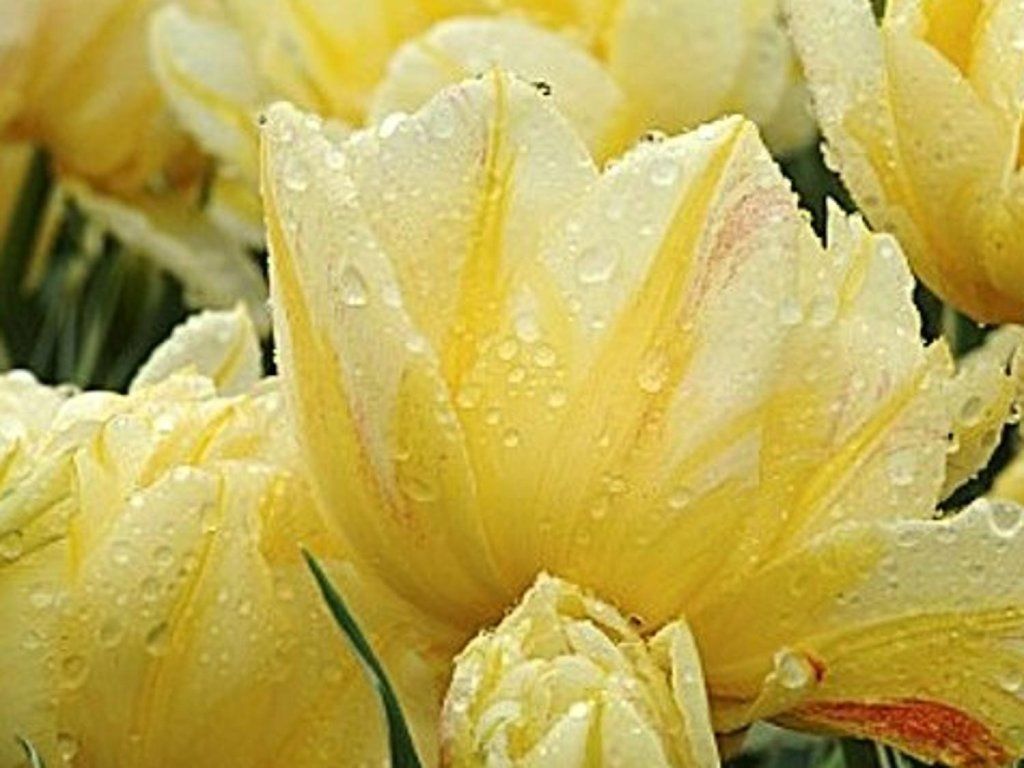 Tulipán 'Monte Feu' - plnokvetý tulipán, ktorý je sfarbený žlto s ľahkou červenou kresbou. Dorastá do výšky 40 cm. Kvitne v máji.