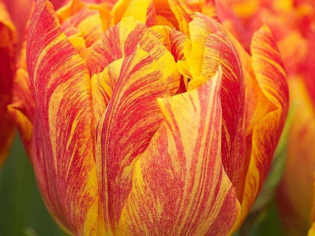 Tulipán ´Monte Flame´ - tulipán s dokonale tvarovanými kvetmi a dvojitým sfarbením. Žltá farba je žíhaná červenou, čo pôsobí ohnivým dojmom. Kvitne v máji. Vynikne ako v záhrade, tak vo váze.