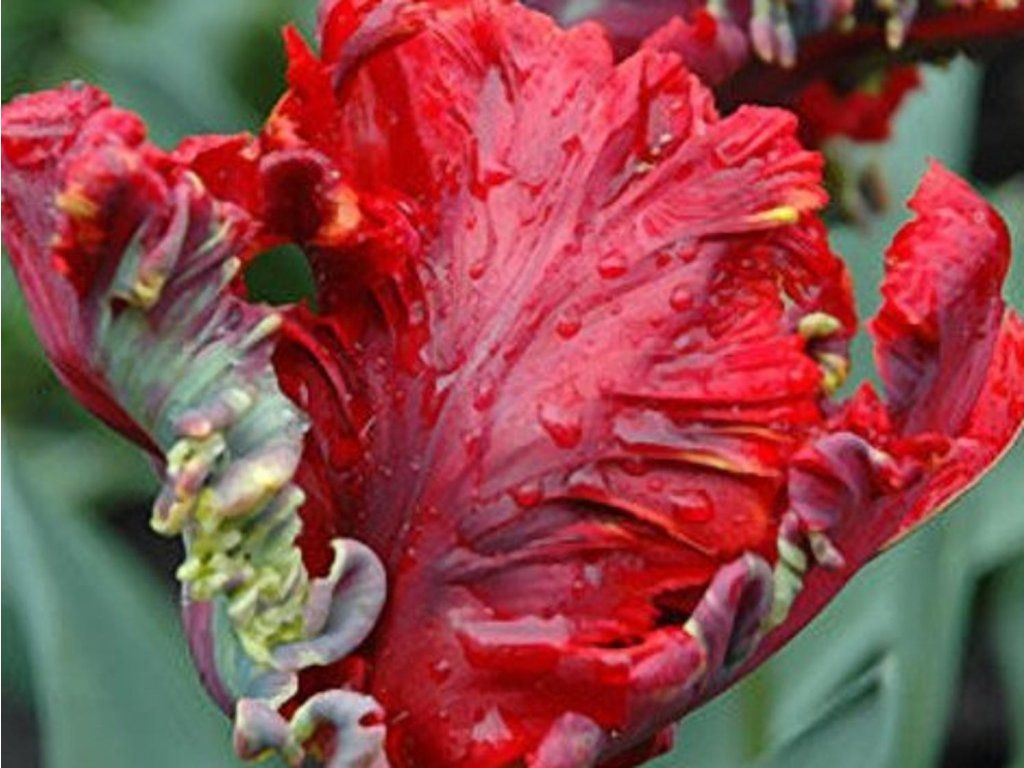 Tulipán ´Rococo´ - NOVINKA v našej ponuke! Tulipán so silne zvlnenými okvetnými lístkami. Je zafarbená do tmavopurpurovej farby, ktorá prechádza až do karmínovej. Zelená kresba umocňuje jej krásu. Dorastá až do 50 cm.