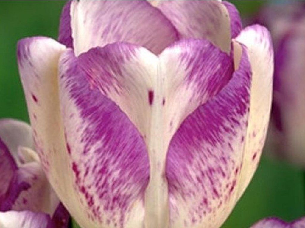 Tulipán ´Shirley´ - zaujímavo sfarbený tulipán. Okvetné lístky sú biele s fialovým žíhaním. Tulipán pôsobí nežne a zjemní každú záhradku. Dorastá do výšky 50 cm a kvitne od apríla do mája.