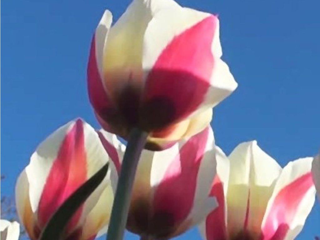 Tulipán 'Spring Surprise' - prostriedky okvetných lístkov sú ružové, okraje biele. Tým vzniká nádherné prúžkovanie. Kultivar dorastá do výšky 40 cm. Kvitne na prelome apríla a mája.
