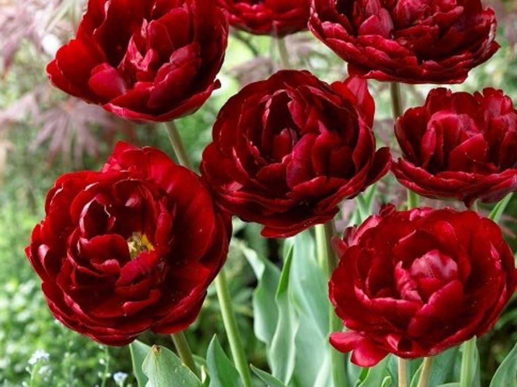 Tulipán 'Uncle Tom'- plné kvety, ktoré sú veľmi podobné kvetom pivoniek. Farba je veľmi výrazná, gaštanovo červená. Kvety sú nesené silnými stonkami, puky sú spočiatku viac do čiernej farby. Dorastá do výšky okolo 45 cm, kvety potom majú okolo 10 cm. Nakvitá od apríla do mája. Svojím sfarbením je vhodný ako solitér.