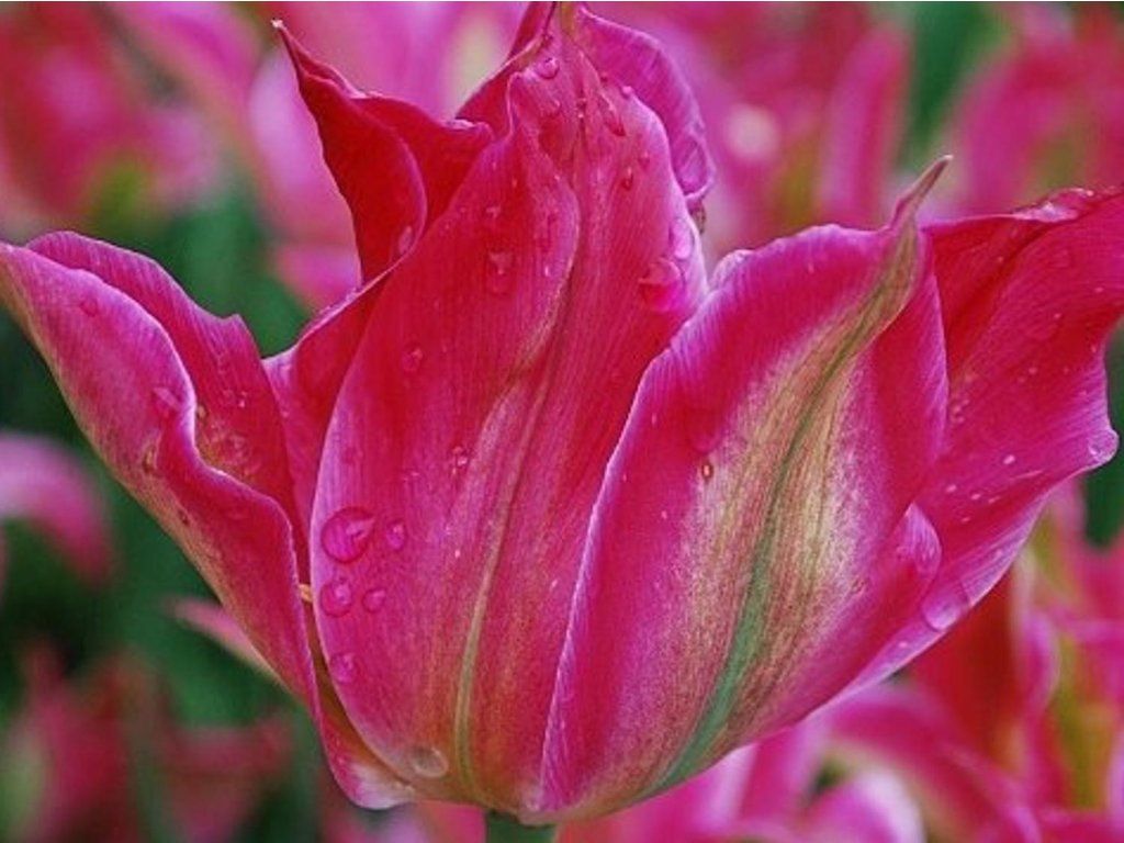 Tulipán 'Virichic' - NOVINKA v našej ponuke! Nádherný tulipán s lesklými kvetmi, ktoré majú jasné ružové a ľahko zašpicatené okvetné lístky, ktoré sú v strede zdobené sviežou zelenou farbou. Dorastá do výšky 50 cm.