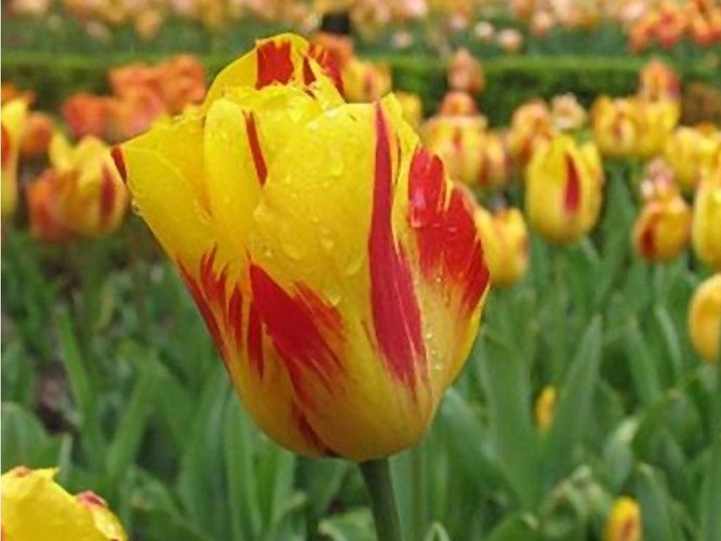Tulipán 'Washington' - skvostný žltý tulipán s červeným žíhaním. Dorastá do výšky 55 cm. Kvitne od apríla do mája. Odroda sa výborne hodí do okrasných záhonov.